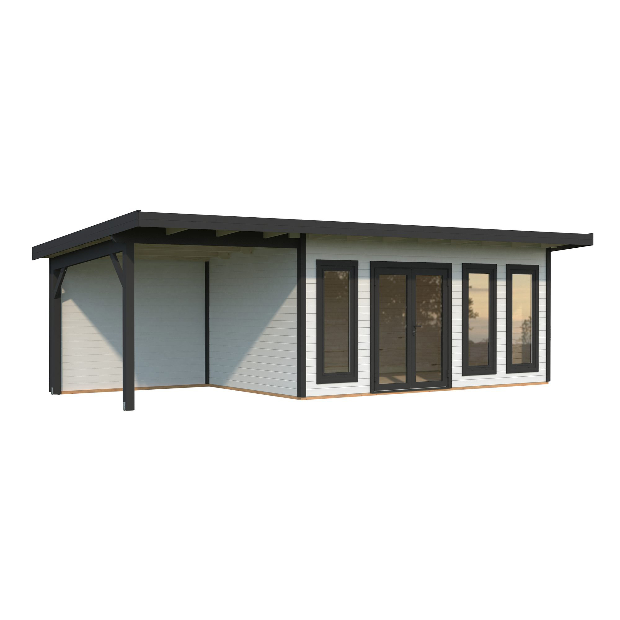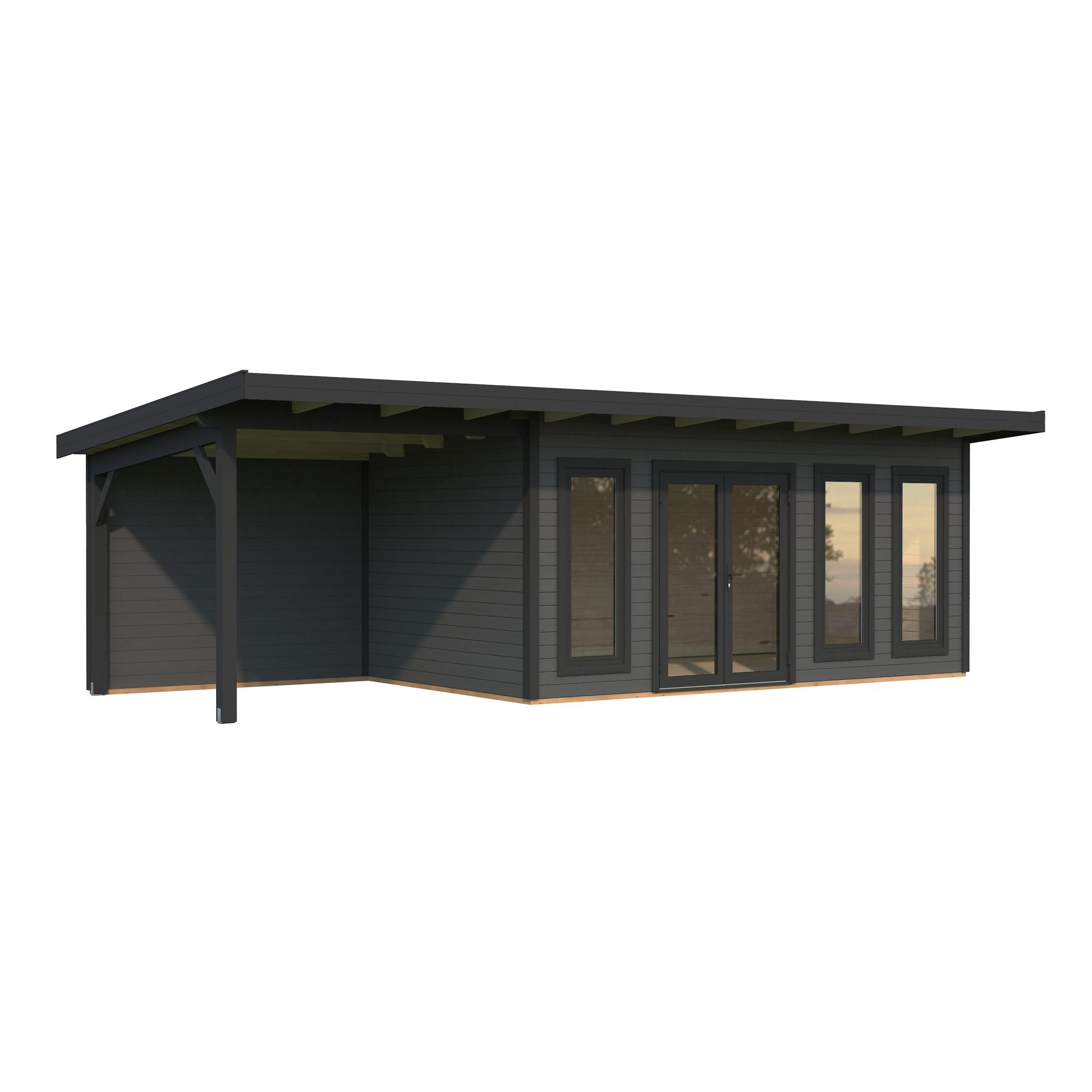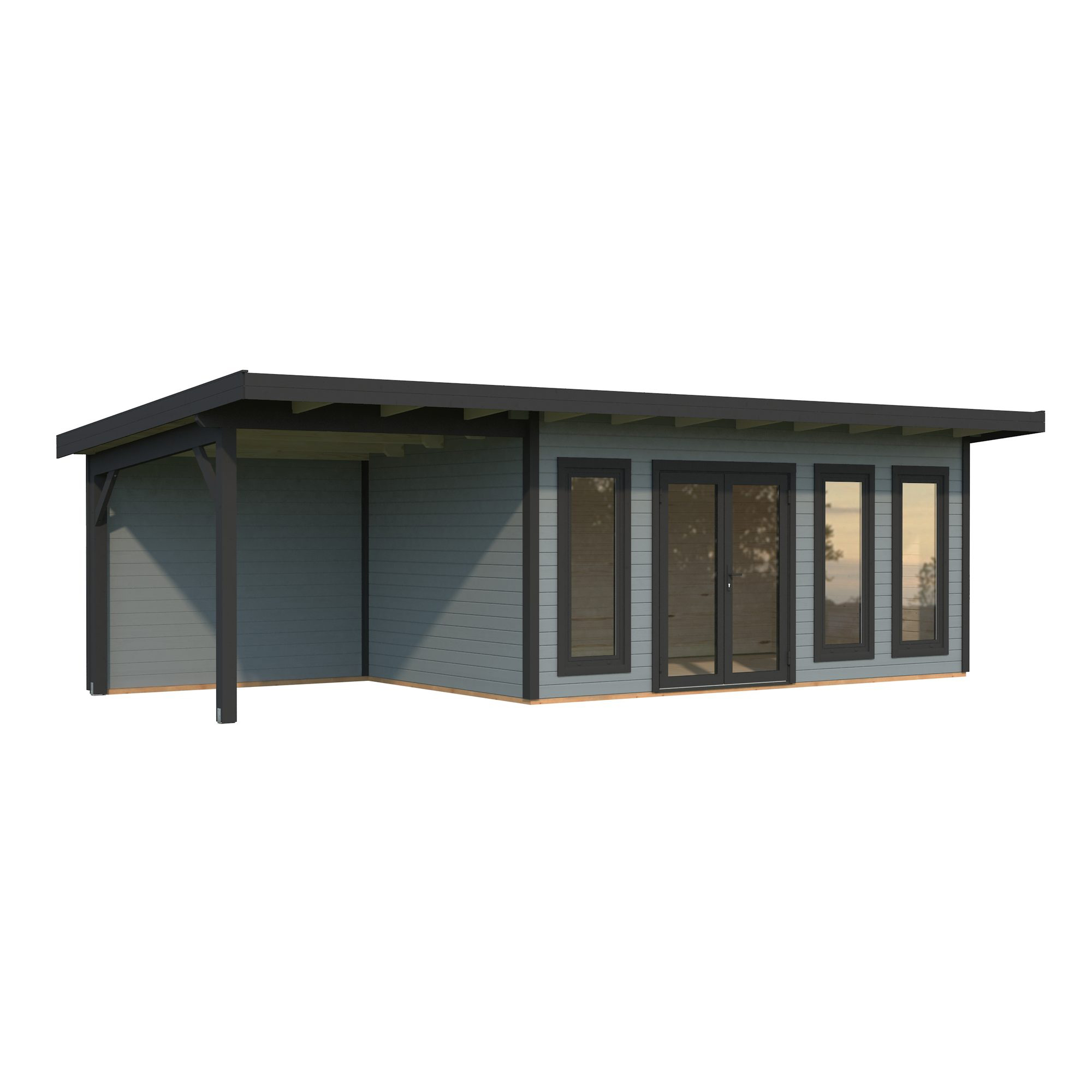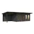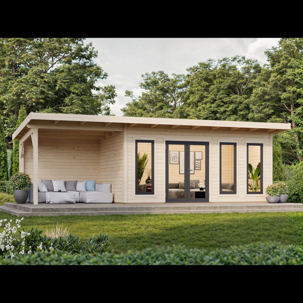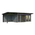Modern trädgårdsstuga med skyddstak och dubbelglasade aluminiumdörrar och fönster