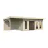 Den moderna trädgårdsstugan Aurelia 15,2+7,9 m² är en mångsidig utomhusbyggnad, utformad för modernt och bekvämt uteliv. Stugan har en generös huvudyta på 15,2 m² samt en sidokonstruktion på 7,9 m² med bakvägg, perfekt för skuggad sittplats eller förvaring.Byggd av högkvalitativ nordisk gran har stugan 44 mm tjocka väggar med moderna skruvade hörnförband som ger både hållbarhet och stil. Den aluminiumramade dörren och de inåtgående tilt- och svängbara fönstren är utrustade med 24 mm härdat isolerglas, vilket säkerställer utmärkt isolering, säkerhet och en tyst och behaglig inomhusmiljö. Planlösningen är vändbar, vilket gör det enkelt att placera stugan efter trädgårdens förutsättningar.