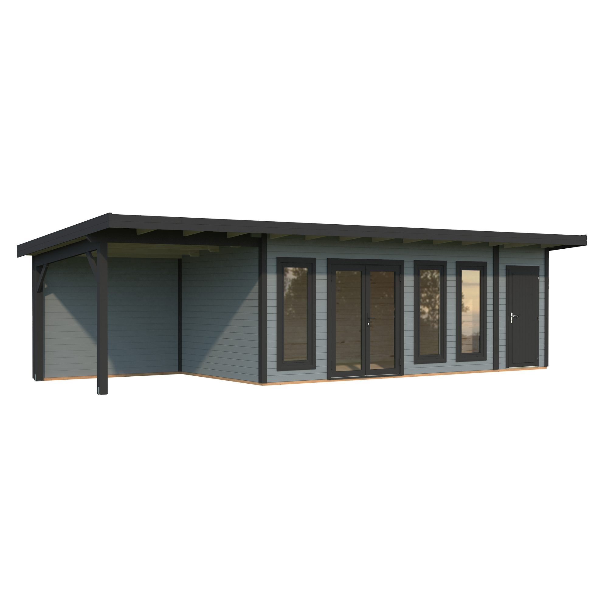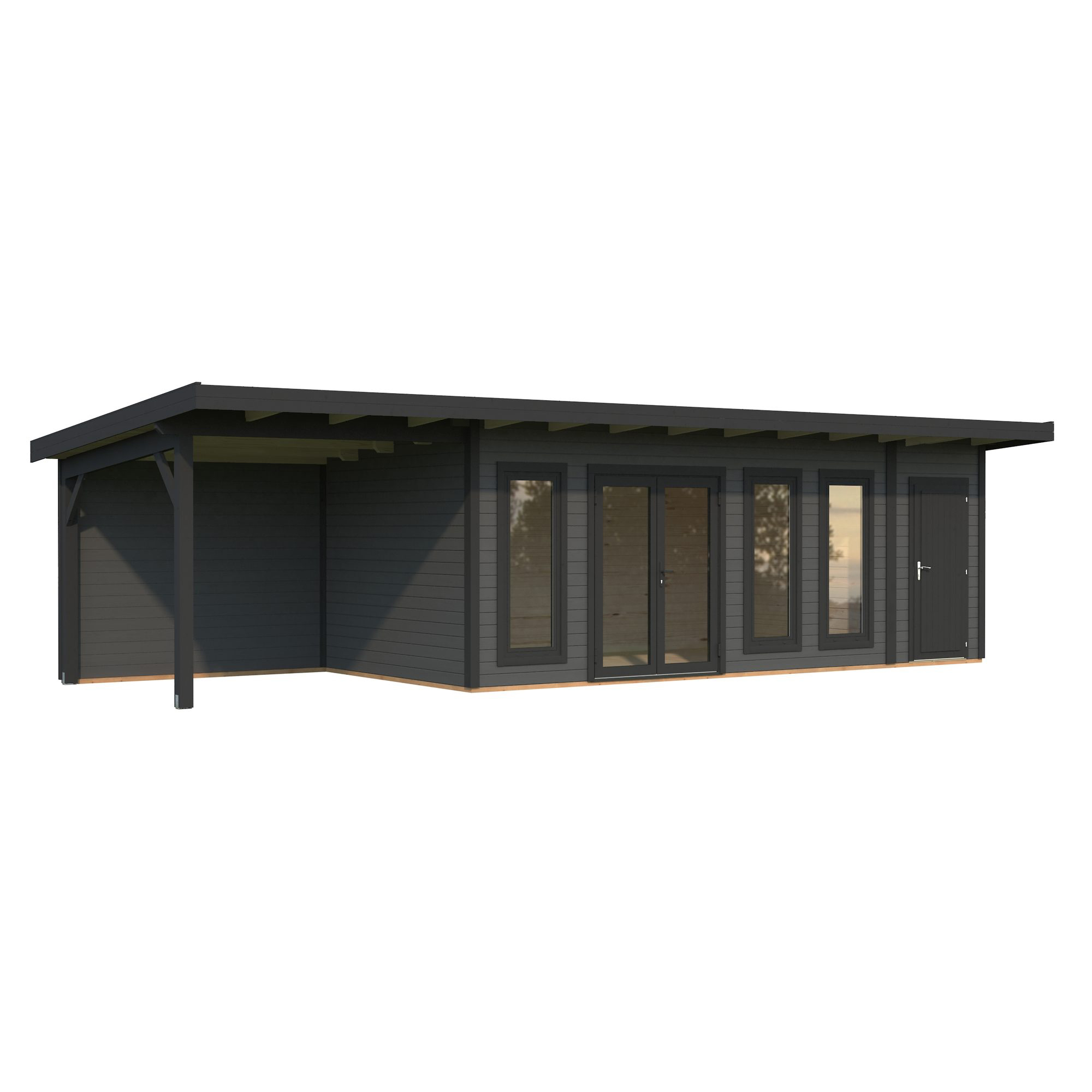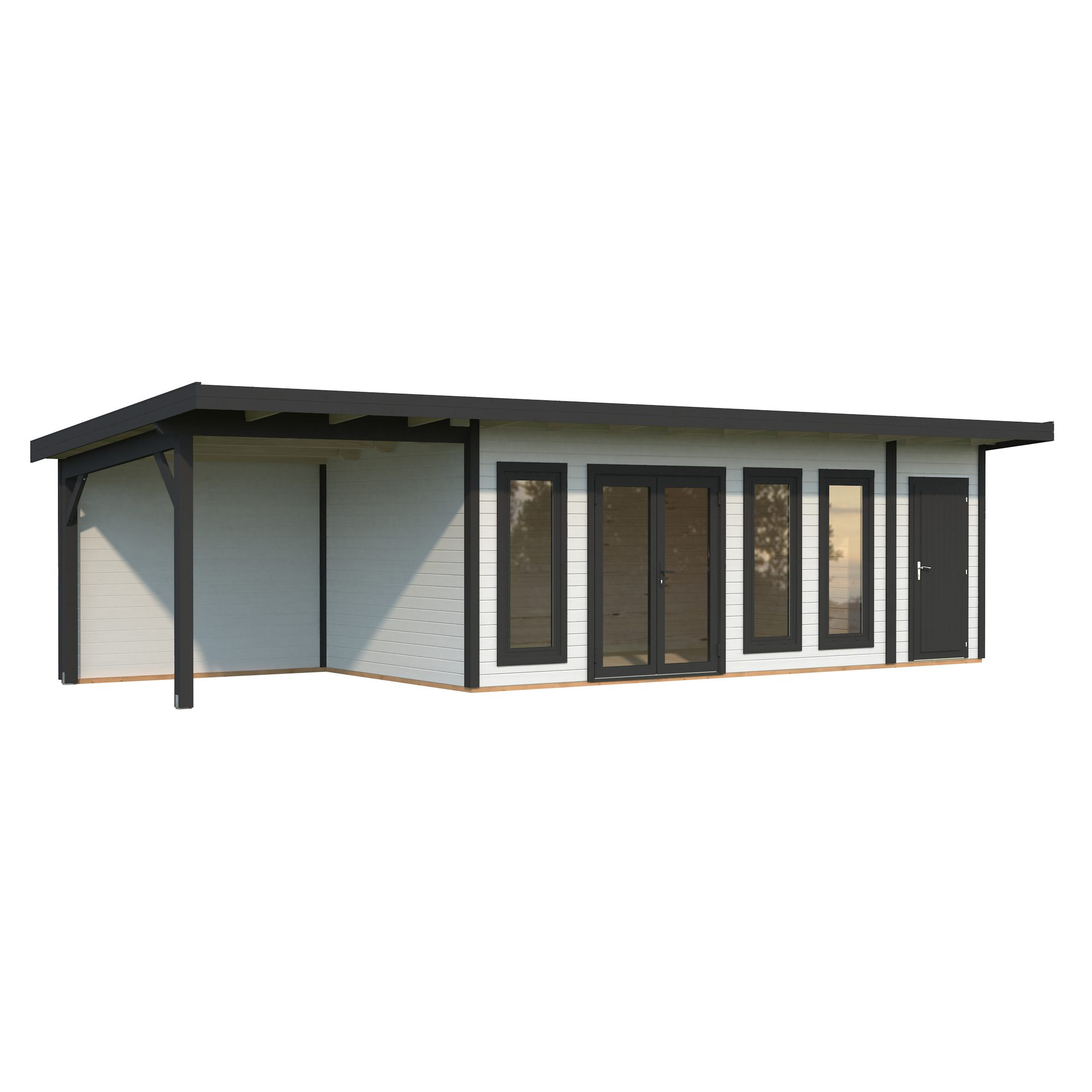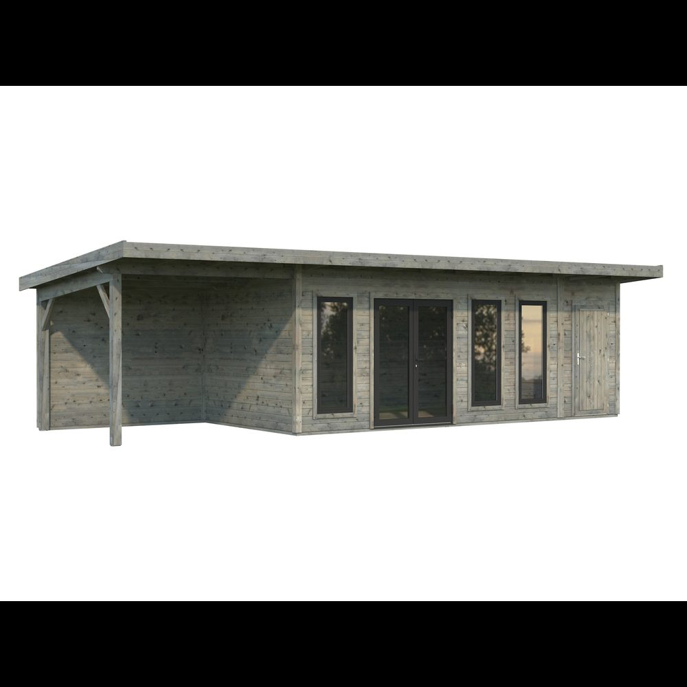 Modern trädgårdsstuga med sidobyggt förråd, skyddstak och dubbelglasade aluminiumdörrar och fönster