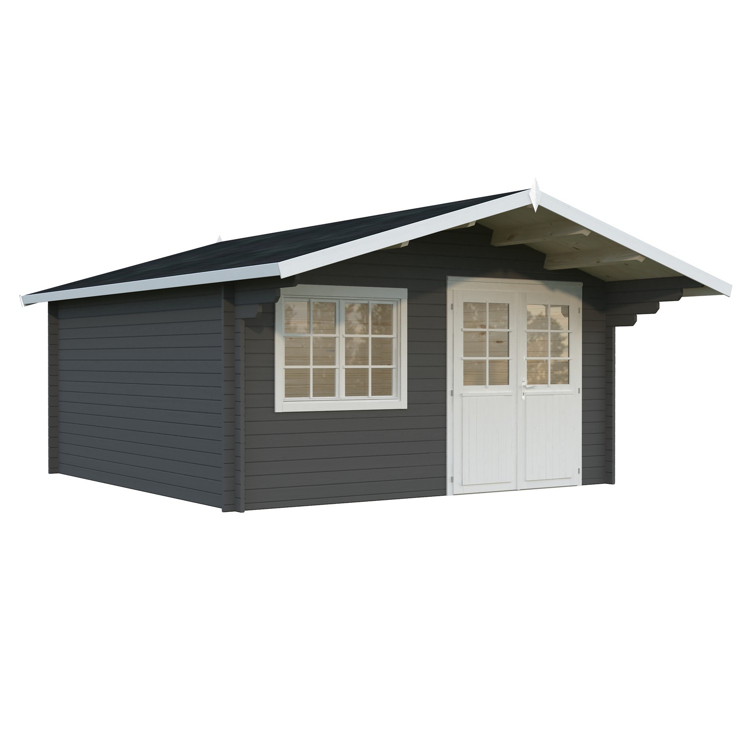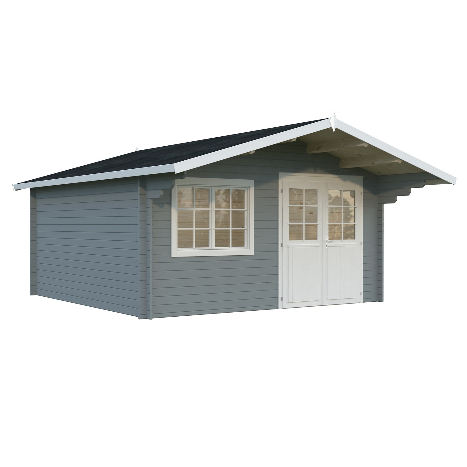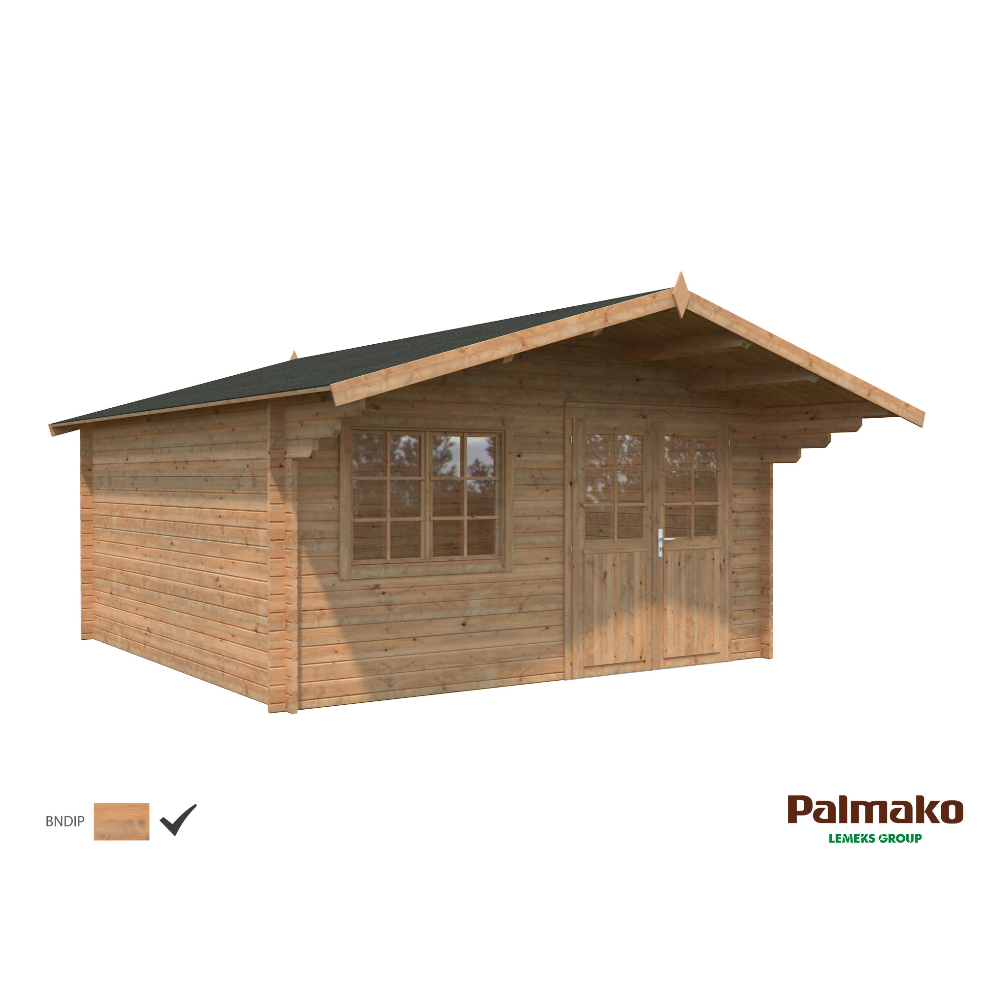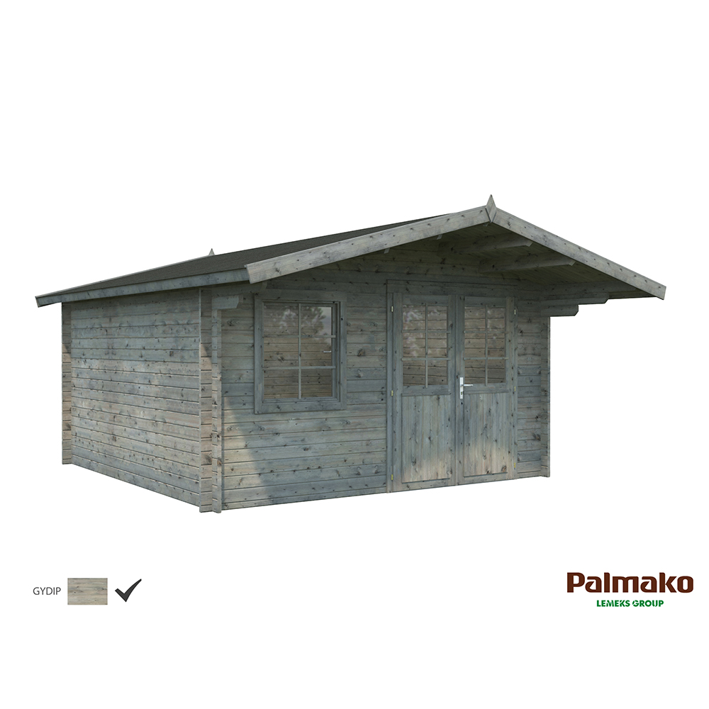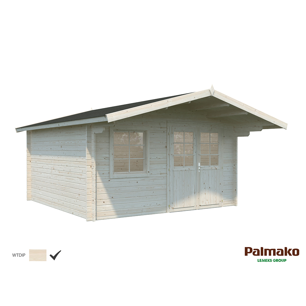 Stuga av 40 mm knuttimmer, vindtäta dubbelhaksknutar och 132 cm takutsprång över entrén. Stugan har ett spröjsat enkelfönster med vrid- och tippfunktion samt en halvglasad pardörr med limträkarm, cylinderlås och rostfri plåt som skyddar tröskeln. 5 års garanti.