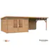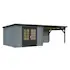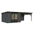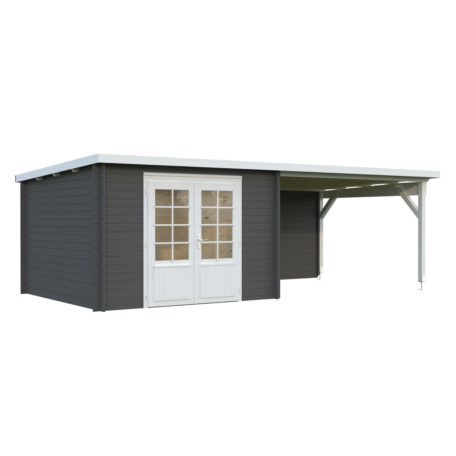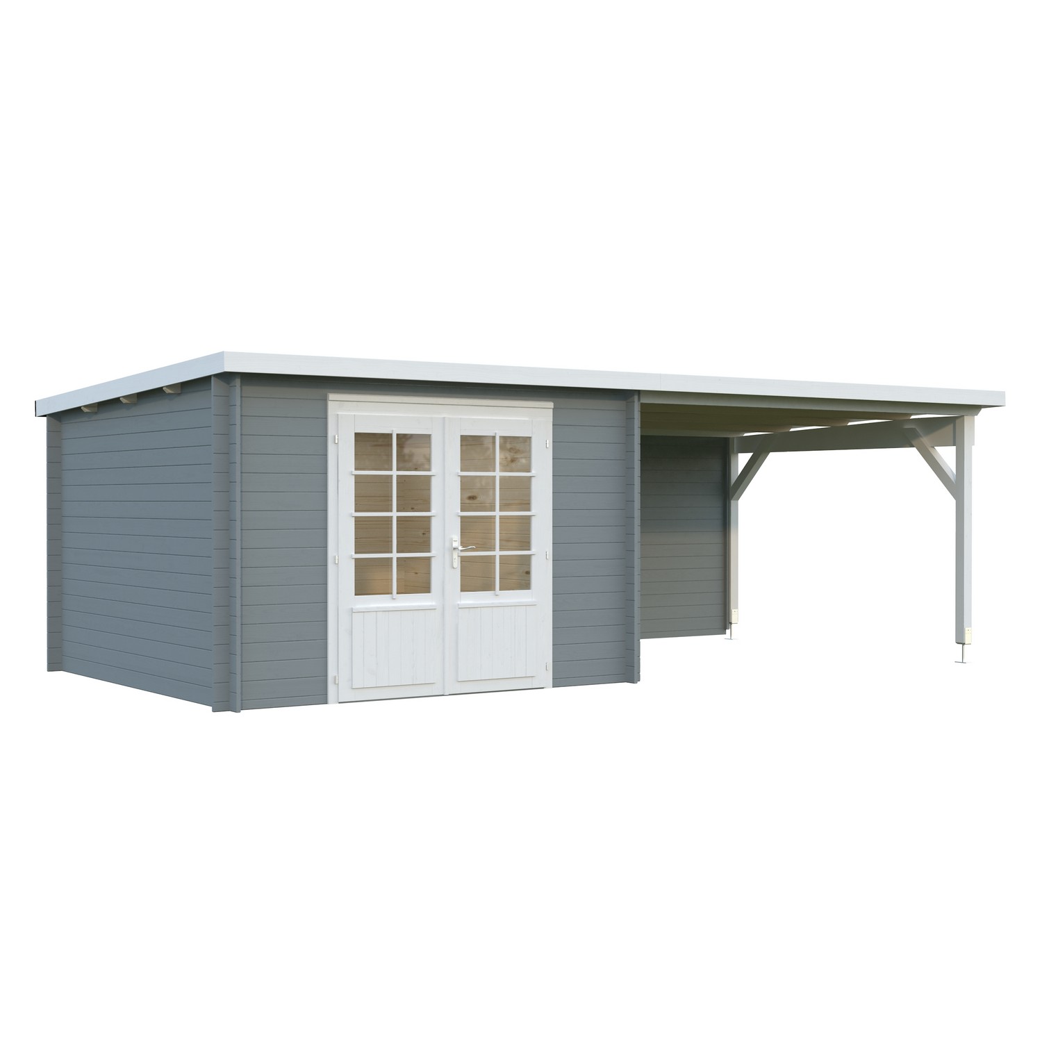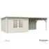 Stuga Ella från Palmako med 28 mm knuttimmer och överbyggd terrass. Stugan är inte snözonklassad - håll därför taket rent från större mängder snö.