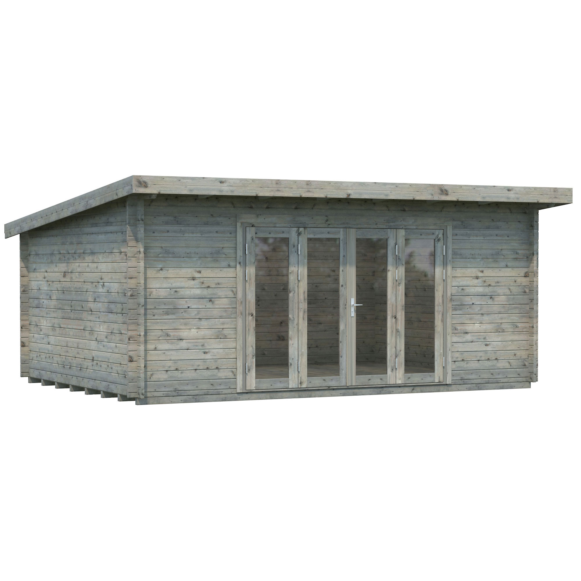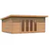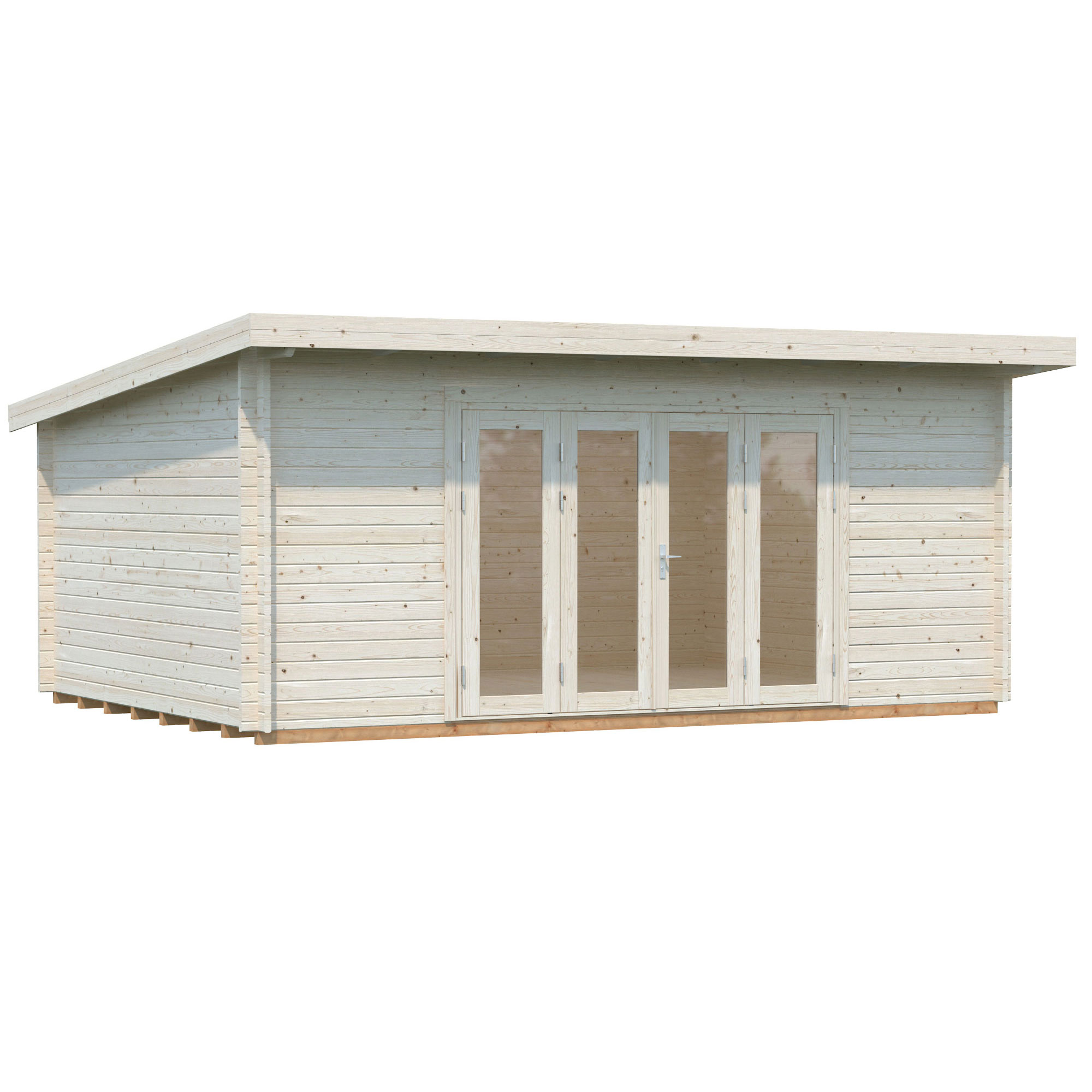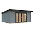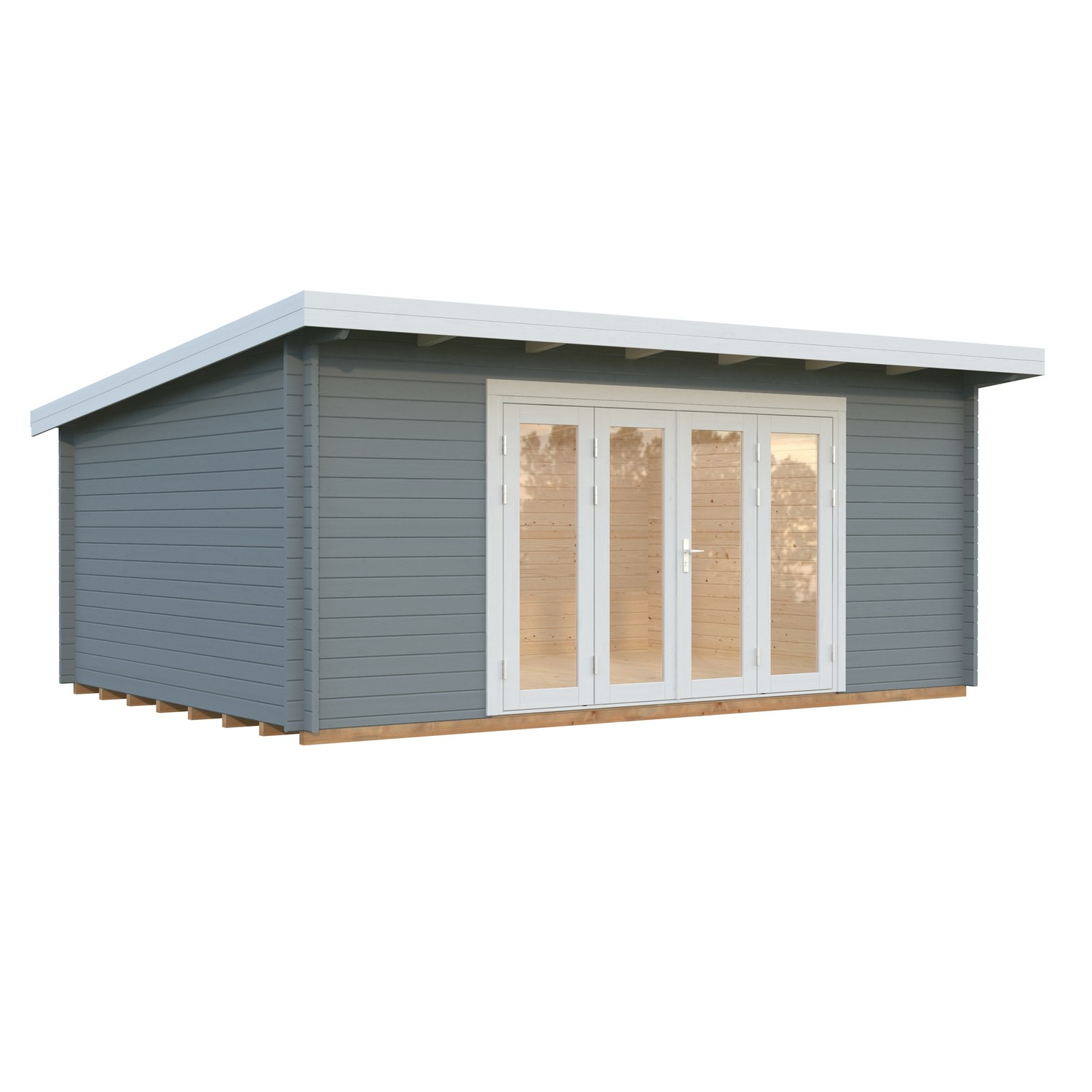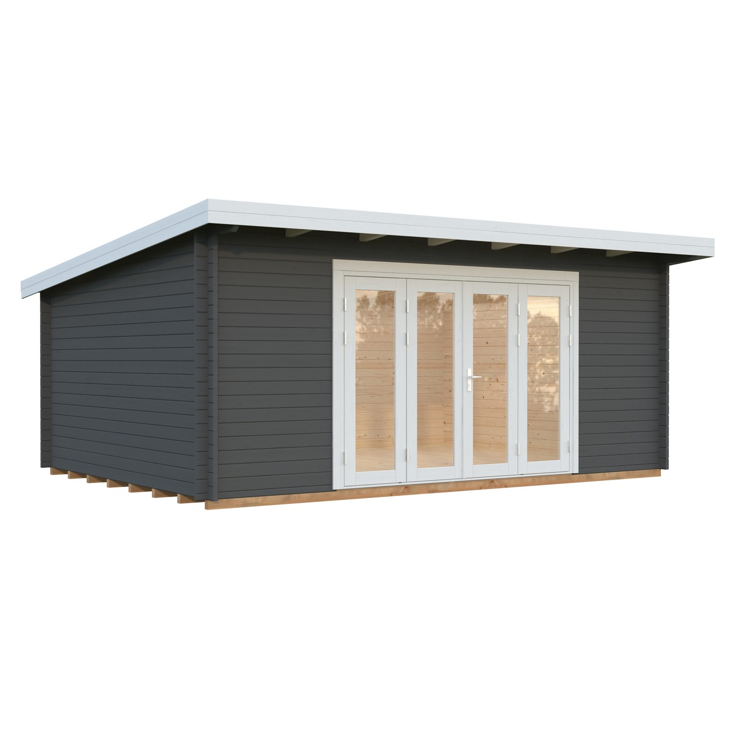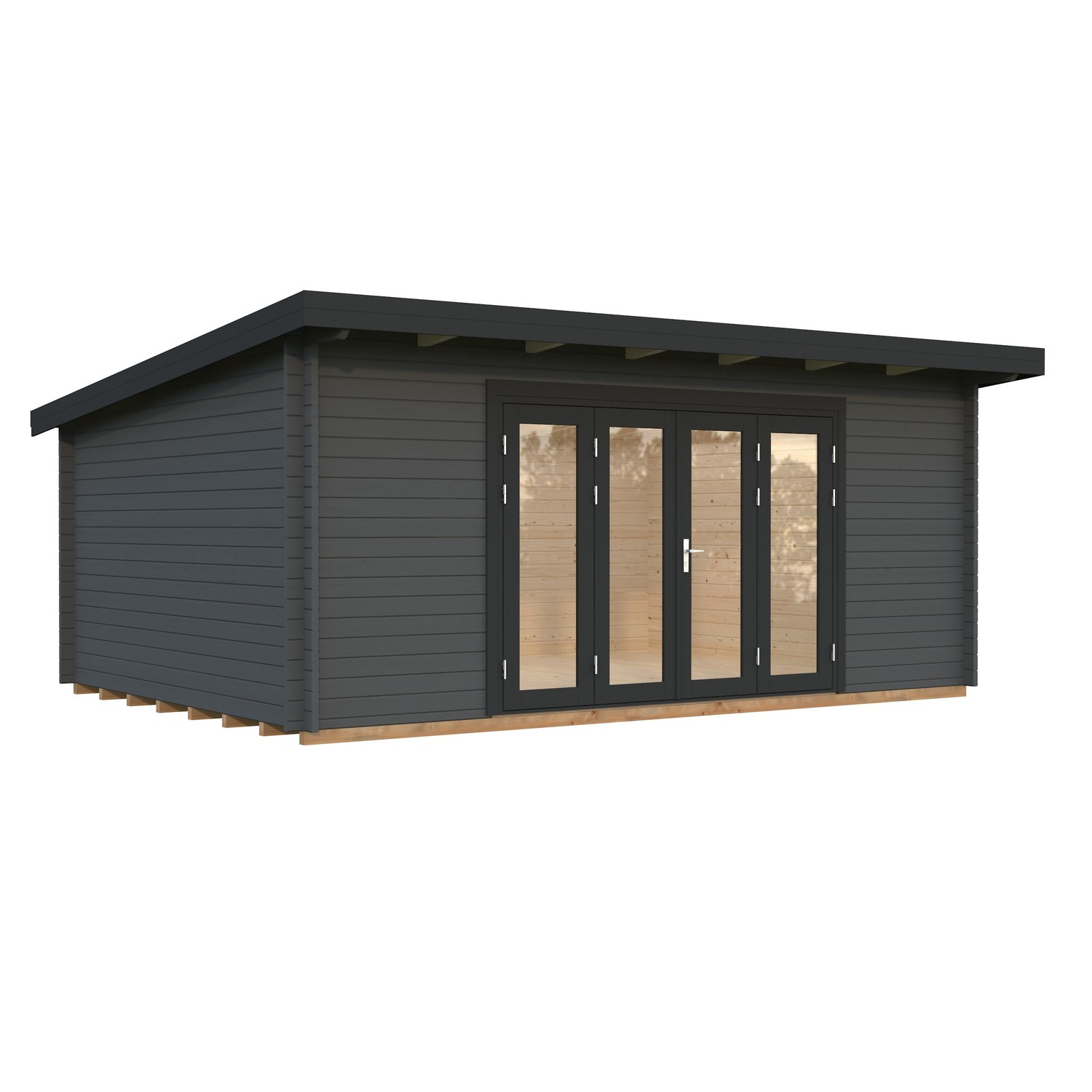 Uthuset Lea med raka linjerna skapar ett modernt uttryck och blir ett stilfullt inslag i din trädgård. Uthuset knuttimras med 44mm tjocka väggar och har en glasad vikdörr med fönster ända ner till golvet. Med den 265cm breda dörröppningen kan du sudda gränsen mellan inne och ute. En modern liten pärla som skapar utrymme för att samla nära och kära i din trädgård.