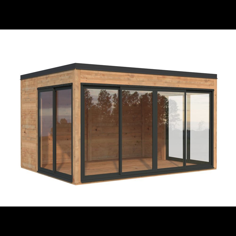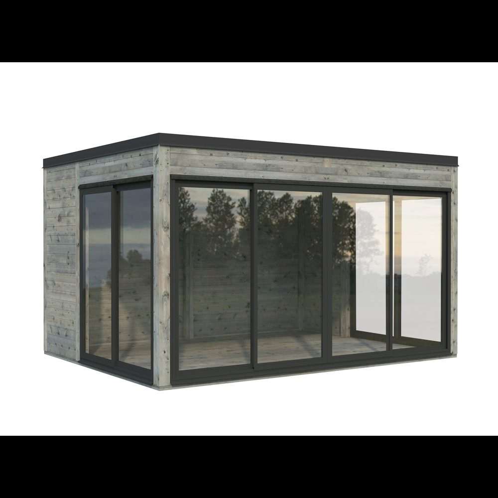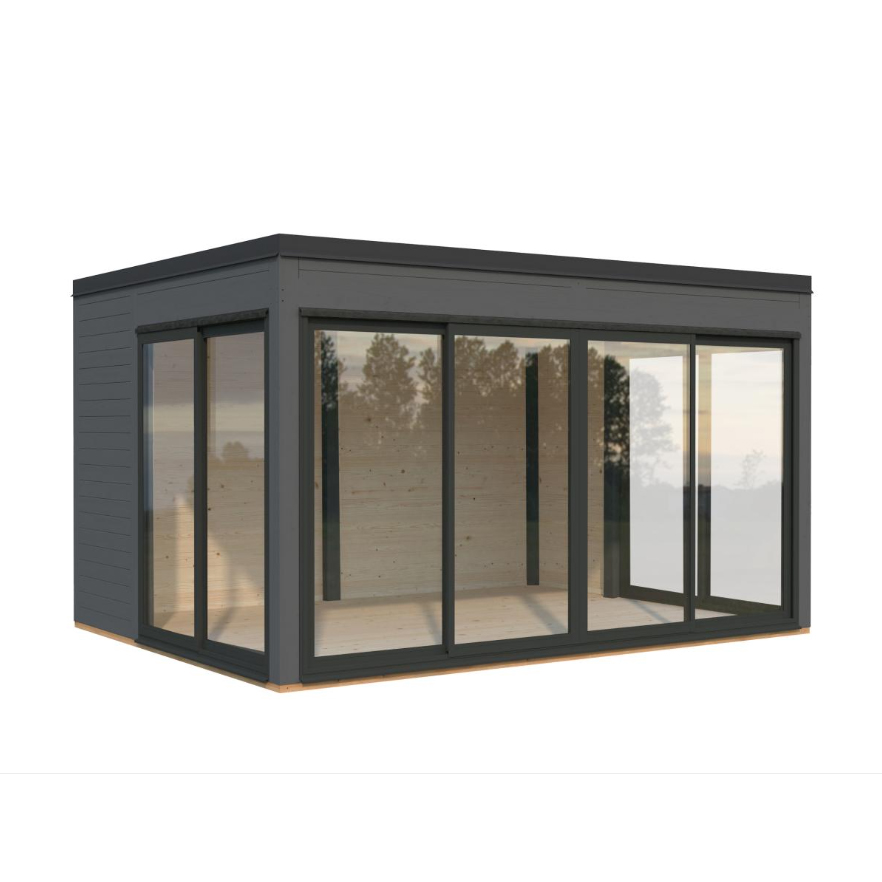 Serena 12,6 m² Slide är en modern och stilren trädgårdsstudio som kombinerar design, hållbarhet och mångsidighet. Dess rena, minimalistiska arkitektur och platta tak gör att den smälter in i moderna utomhusmiljöer.Byggd av högkvalitativ nordisk gran med 44 mm väggstockar och starka laminerade stolpar (120x120 mm) som ger långvarig stabilitet.Framsidan har aluminiumskjutdörrar med fyra glaspartier som öppnas från mitten utåt, och dubbla skjutdörrar på båda sidoväggarna släpper in ännu mer naturligt ljus.