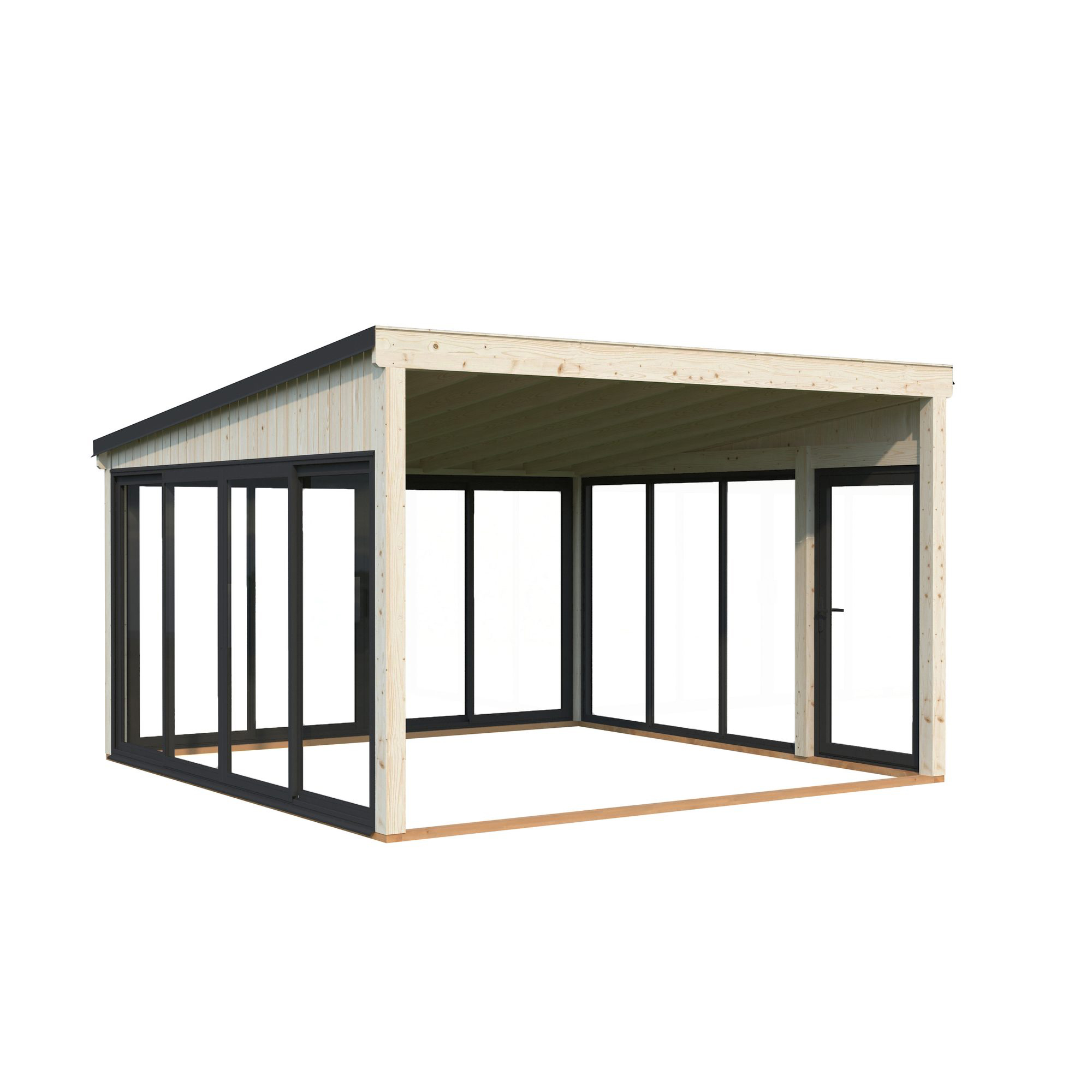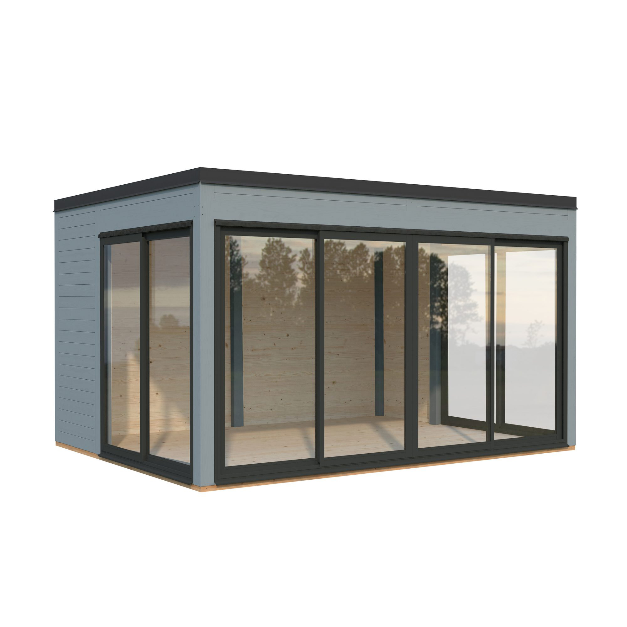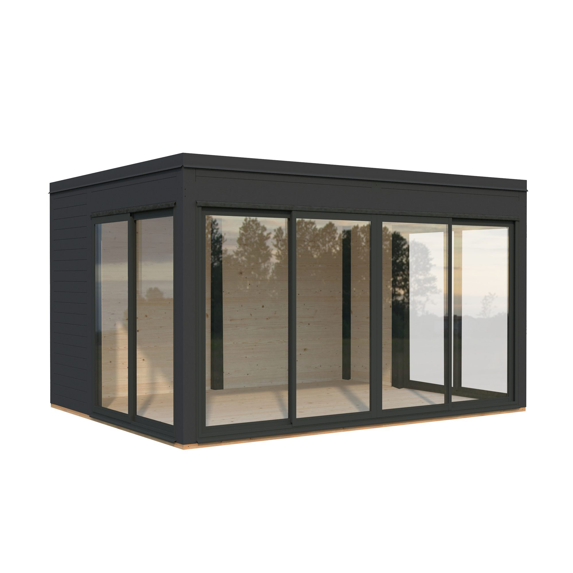 Serena 12,6 m² Slide är en modern och stilren trädgårdsstudio som kombinerar design, hållbarhet och mångsidighet. Dess rena, minimalistiska arkitektur och platta tak gör att den smälter in i moderna utomhusmiljöer.Byggd av högkvalitativ nordisk gran med 44 mm väggstockar och starka laminerade stolpar (120x120 mm) som ger långvarig stabilitet.Framsidan har aluminiumskjutdörrar med fyra glaspartier som öppnas från mitten utåt, och dubbla skjutdörrar på båda sidoväggarna släpper in ännu mer naturligt ljus.