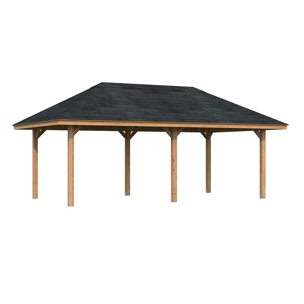Stugan är tillverkad av långsamväxande nordisk gran, med 120x120 mm starka limträstolpar och 19 mm takbrädor. Ett slitstarkt och högkvalitativt material som är särskilt anpassat till de tuffa svenska väderförhållandena. Levereras som byggsats inklusive alla fästelement.