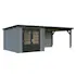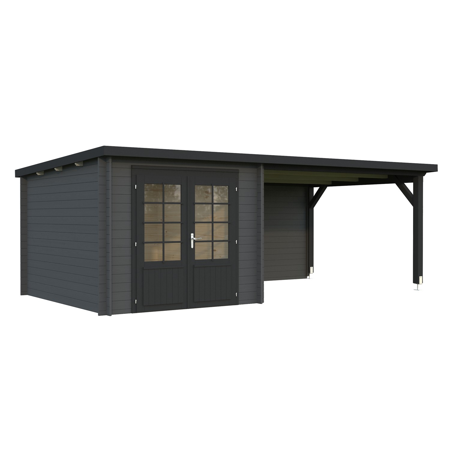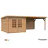 Stuga Ella från Palmako med 28 mm knuttimmer och överbyggd terrass. Stugan är inte snözonklassad - håll därför taket rent från större mängder snö.