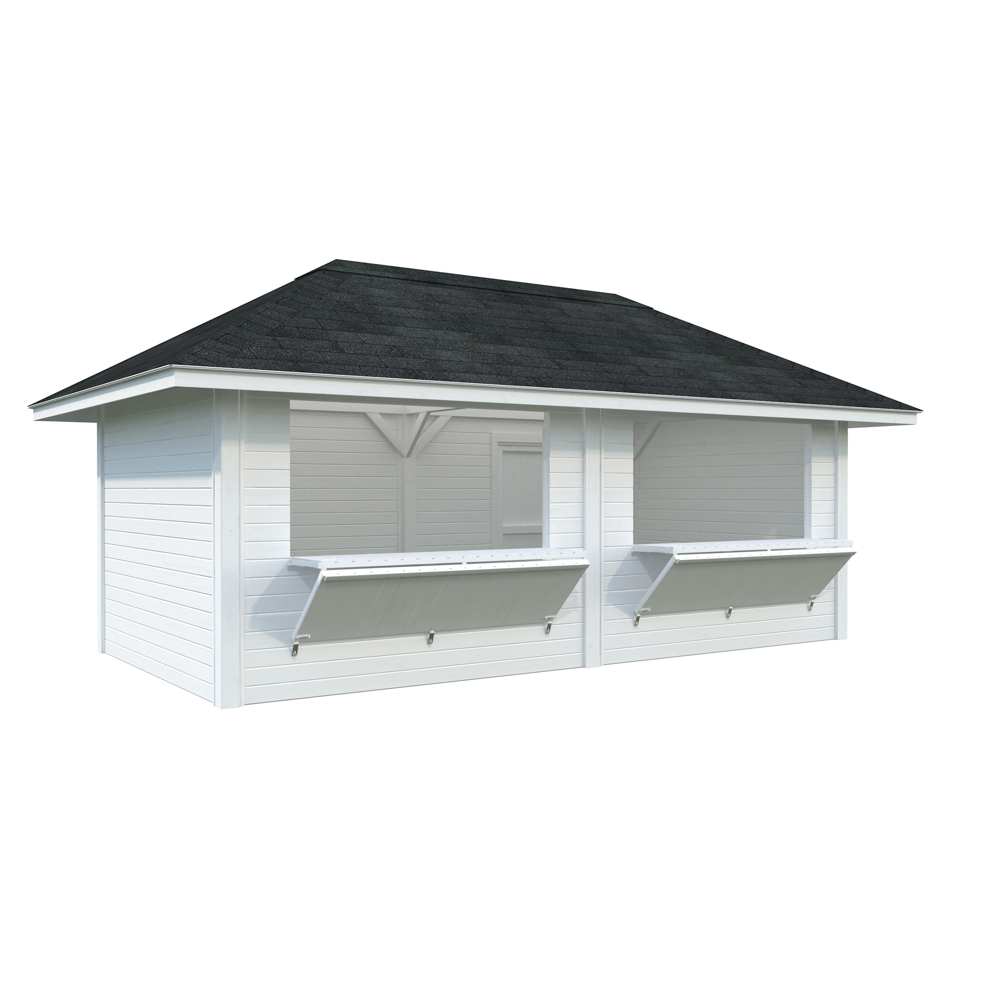 Denna rymliga kiosk med två luckor kan användas på marknader, mässor, idrottsplatser etc.