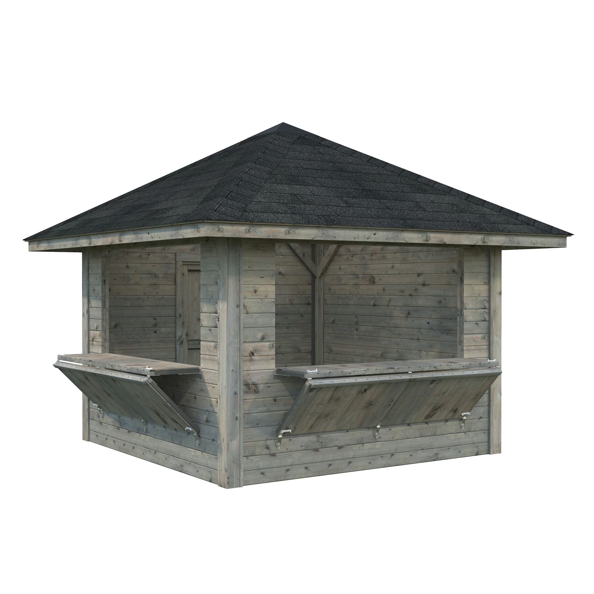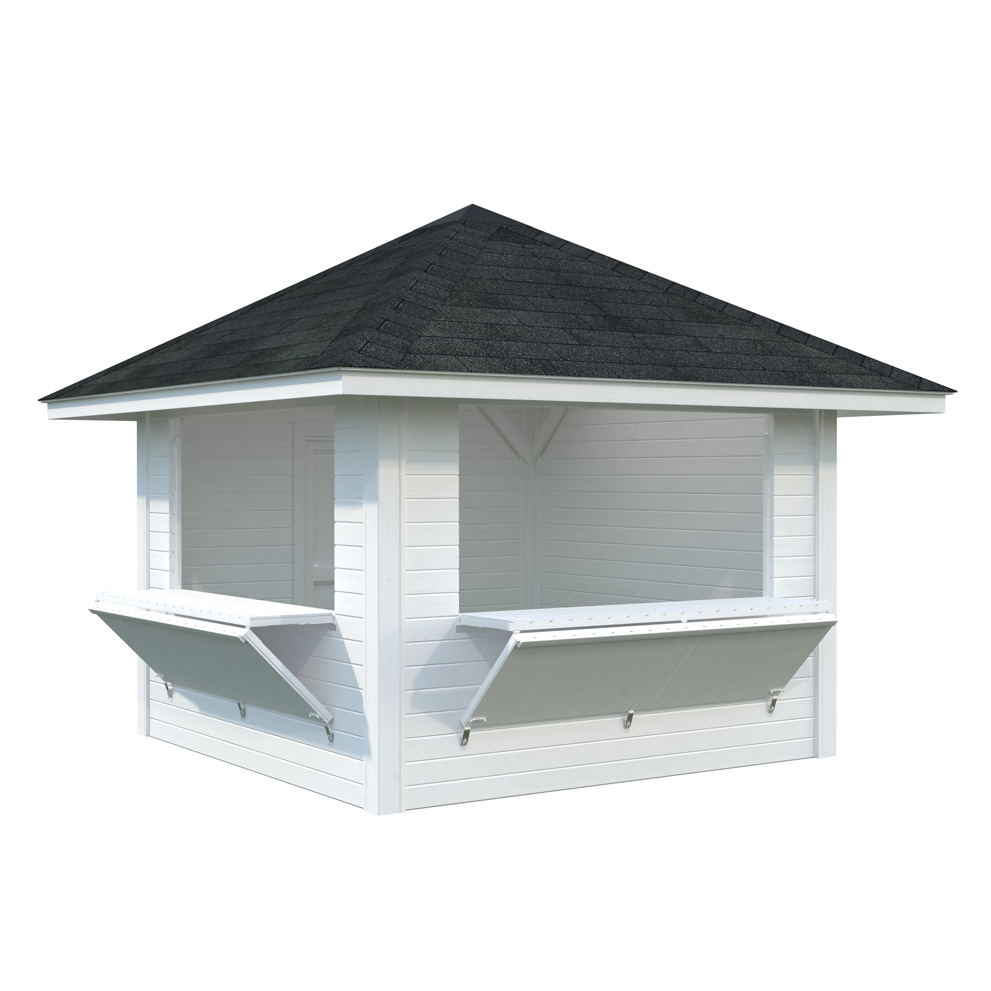 Kiosken är tillverkad av kraftig limträkonstruktion, 19 mm takskiva och 28 mm väggskiva, och är lätt att montera. Tillverkad av nordisk gran med 120x120 mm starka limträstolpar och 19 mm takbrädor. 28 mm väggstockar.