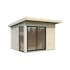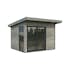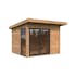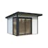 Palmakos stuga Andrea 7,5 m² Slide Plus är ett modernt trädgårdshus med 44 mm tjocka väggar, flackt tak och 24 mm härdat energiglas i aluminium för skjutdörrar.