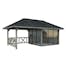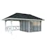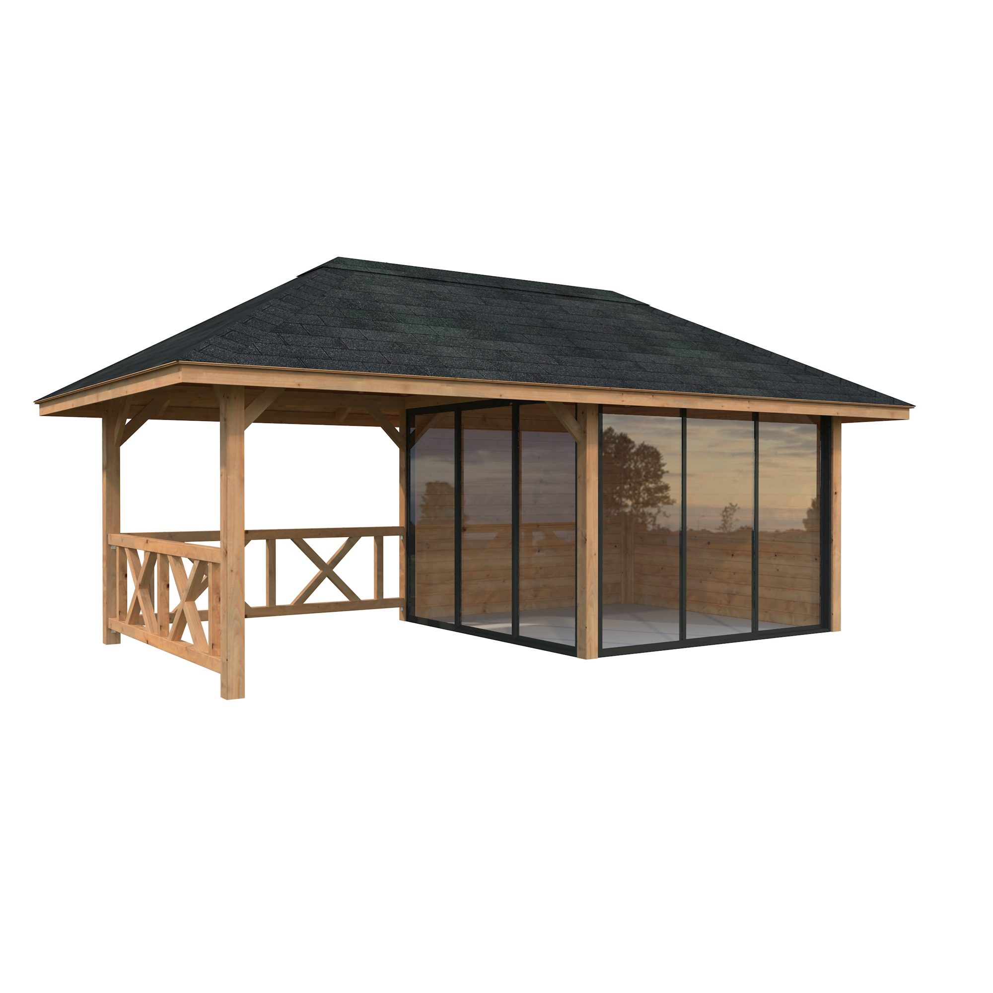 Tillverkad av nordisk gran med 120x120 mm starka limträstolpar och 19 mm takbrädor. Låsbara skjutdörrarna i 4 mm härdat glas och aluminium. 28 mm väggstockar.