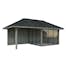 Tillverkad av nordisk gran med 120x120 mm starka limträstolpar och 19 mm takbrädor. Låsbara skjutdörrarna i 4 mm härdat glas och aluminium. 28 mm väggstockar.