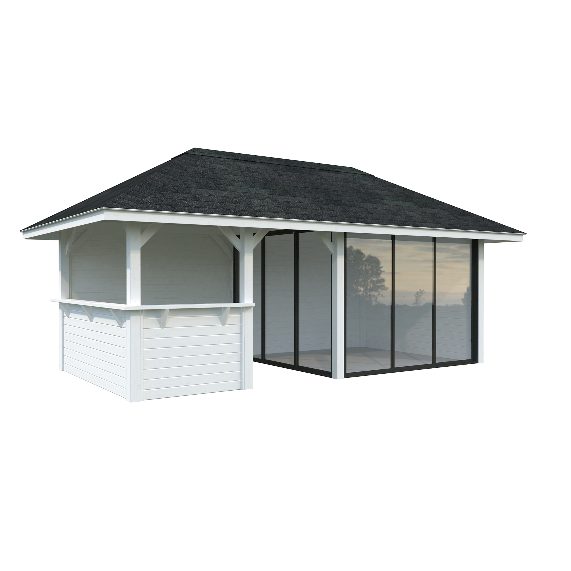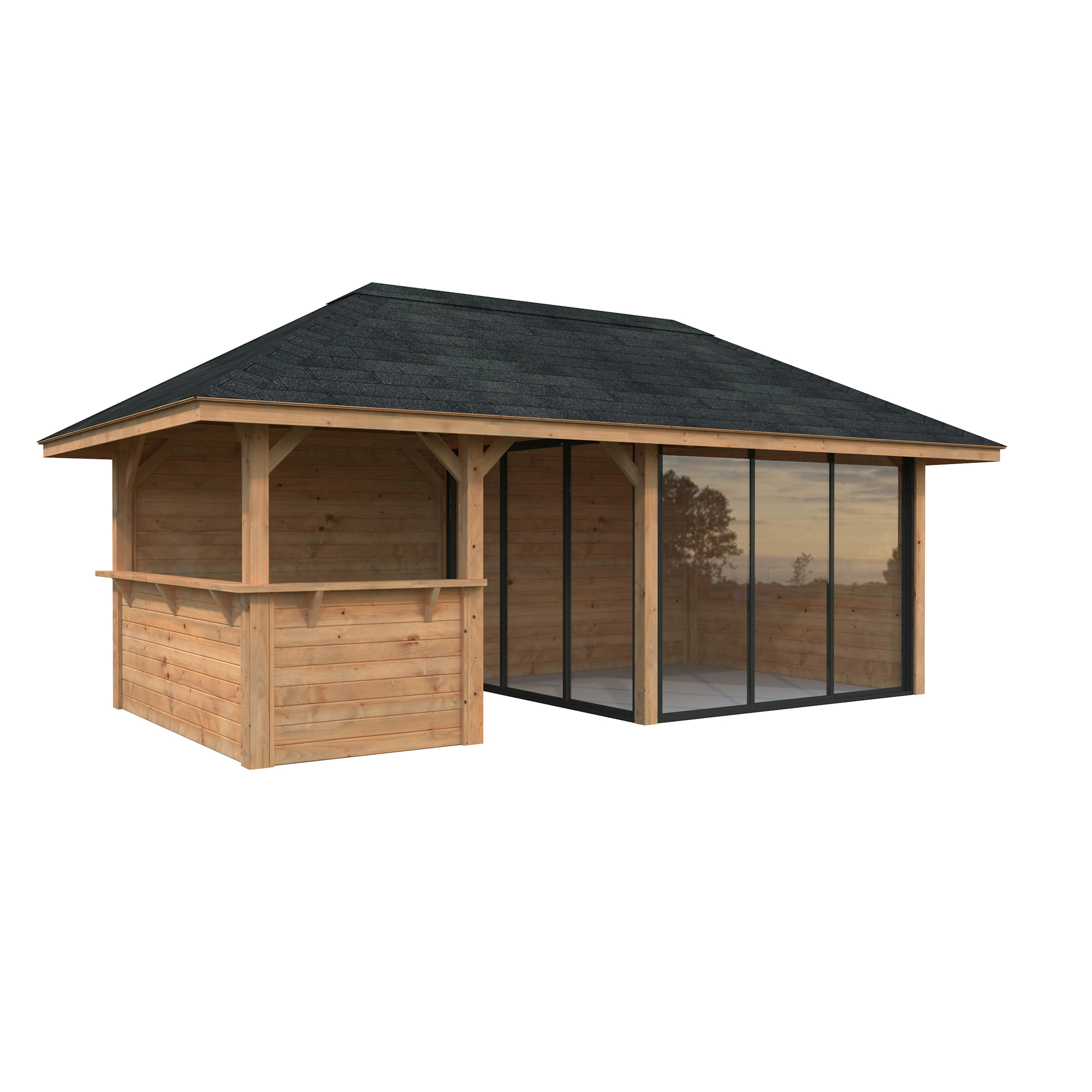 Tillverkad av nordisk gran med 120x120 mm starka limträstolpar och 19 mm takbrädor. Låsbara skjutdörrarna i 4 mm härdat glas och aluminium. 28 mm väggstockar.
