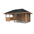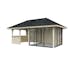 Tillverkad av nordisk gran med 120x120 mm starka limträstolpar och 19 mm takbrädor. Låsbara skjutdörrarna i 4 mm härdat glas och aluminium. 28 mm väggstockar.