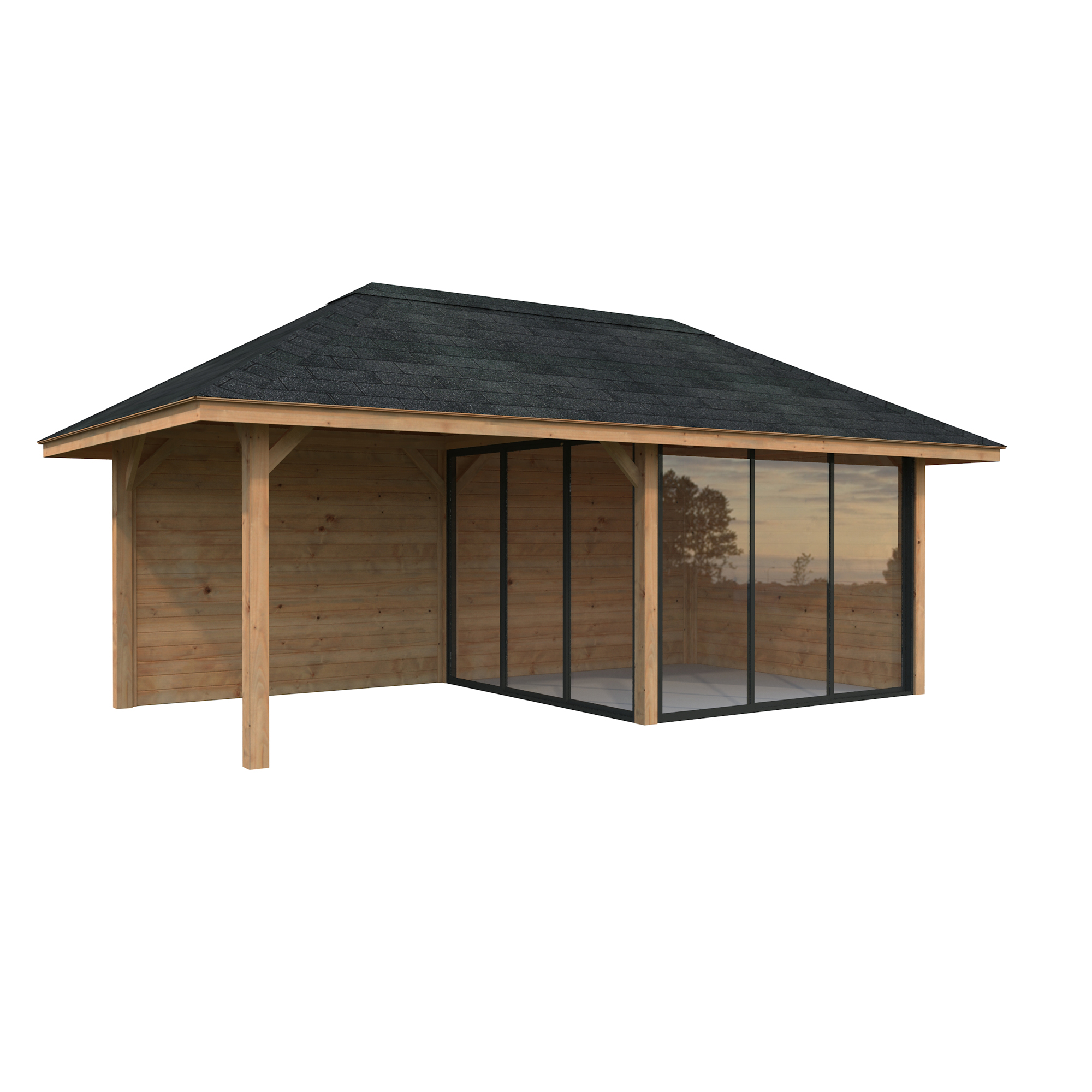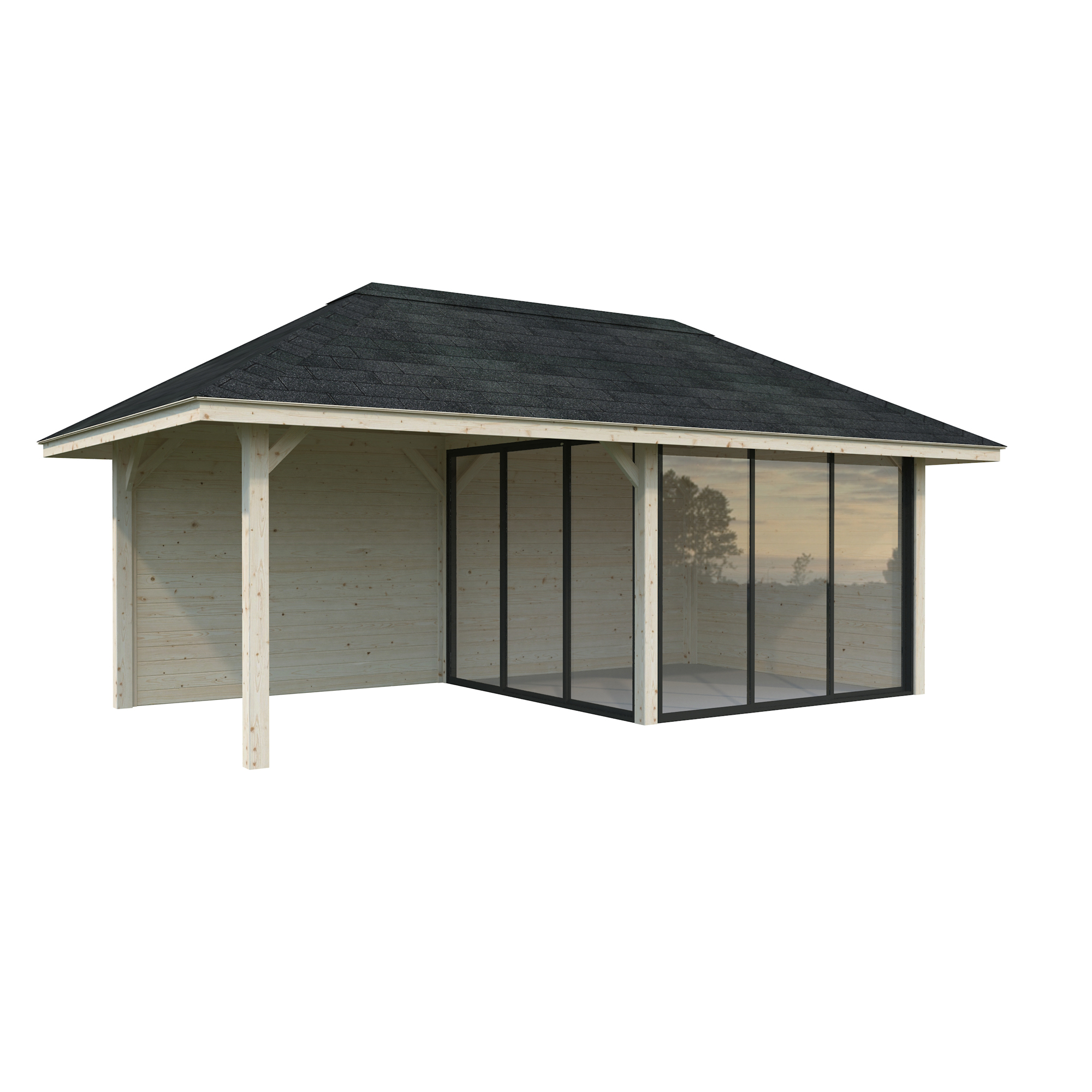 Tillverkad av nordisk gran med 120x120 mm starka limträstolpar och 19 mm takbrädor. Låsbara skjutdörrarna i 24 mm härdat dubbelglas (4 mm härdat glas - 16 mm luftspalt - 4 mm härdat glas) monterat i solida aluminiumprofiler. 28 mm väggstockar.
