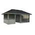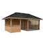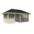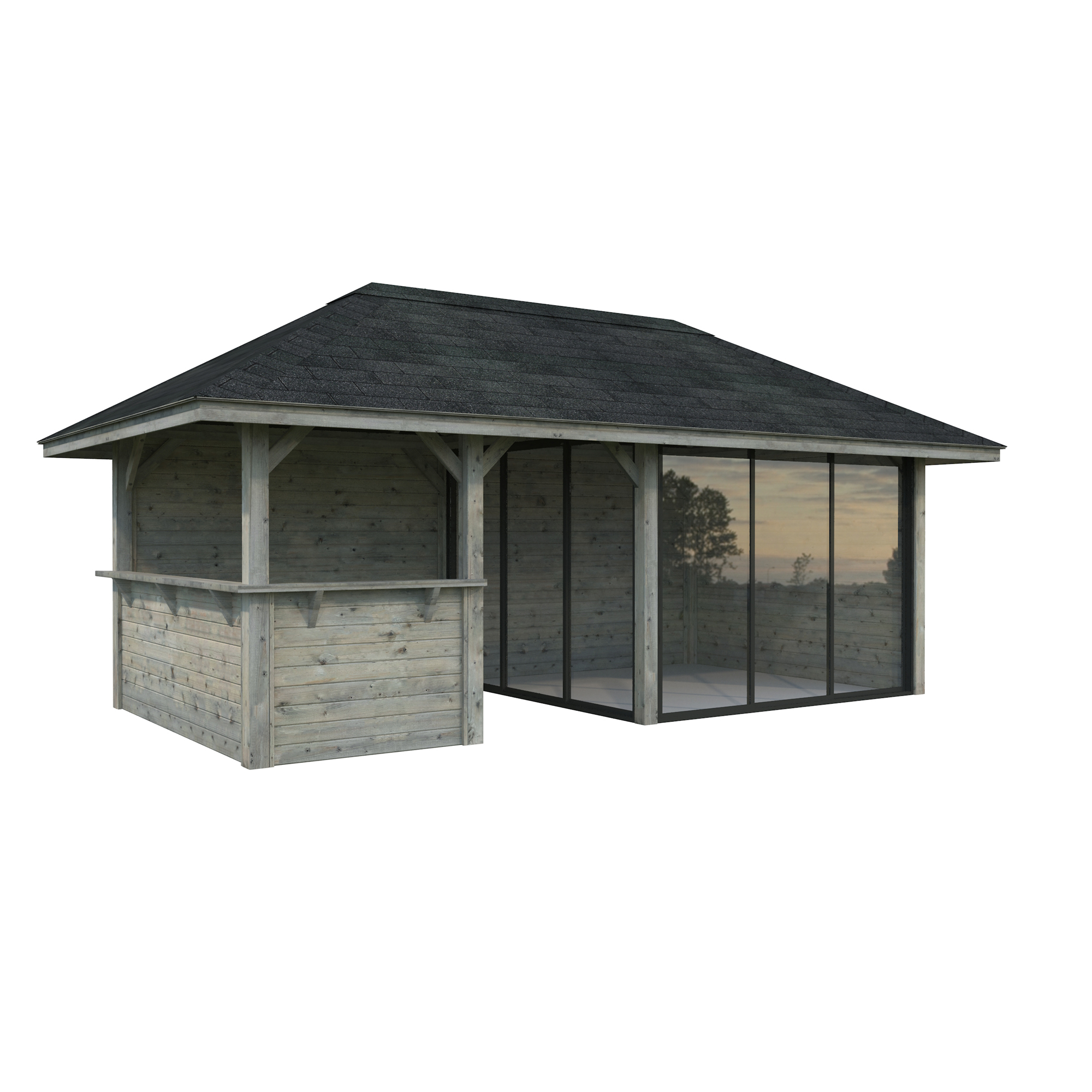 Tillverkad av nordisk gran med 120x120 mm starka limträstolpar och 19 mm takbrädor. Låsbara skjutdörrarna i 24 mm härdat dubbelglas (4 mm härdat glas - 16 mm luftspalt - 4 mm härdat glas) monterat i solida aluminiumprofiler. 28 mm väggstockar.
