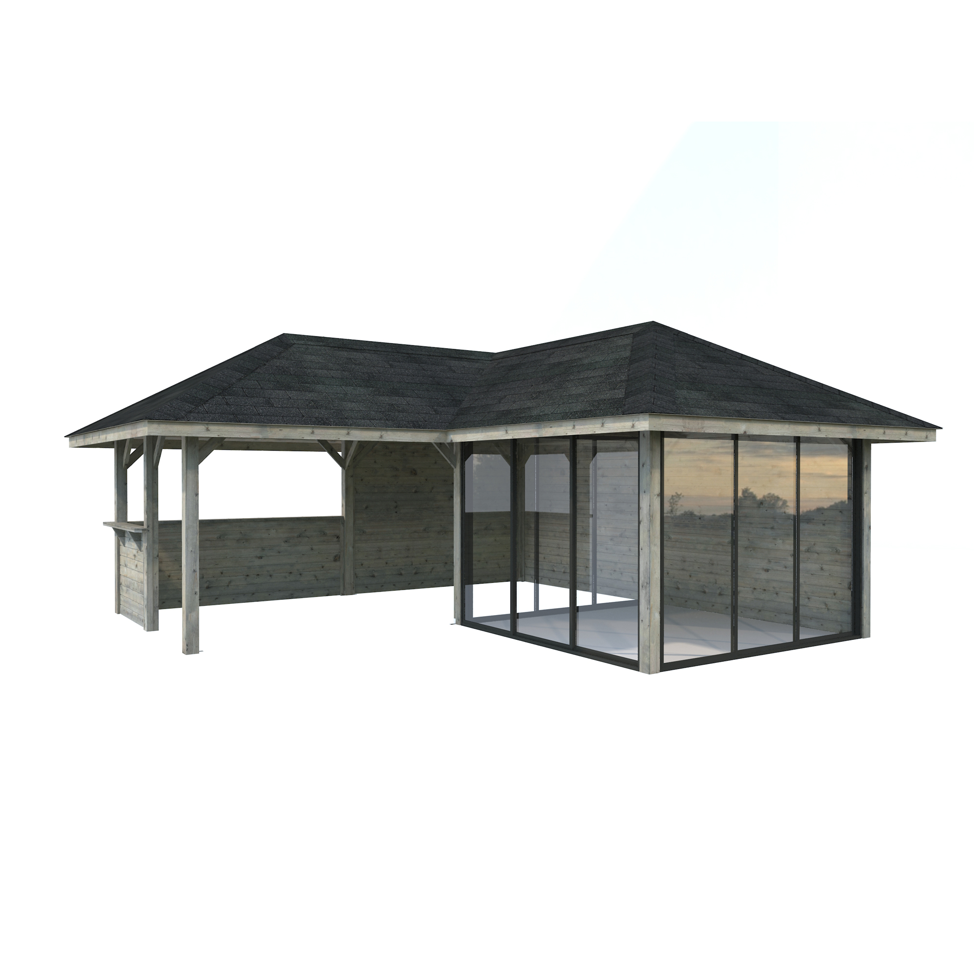 Tillverkad av nordisk gran med 120x120 mm starka limträstolpar och 19 mm takbrädor. Låsbara skjutdörrarna i 4 mm härdat glas och aluminium. 28 mm väggstockar.
