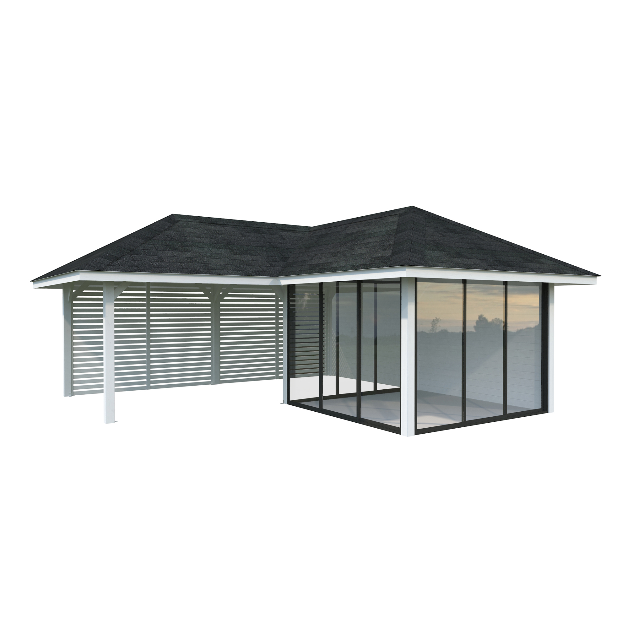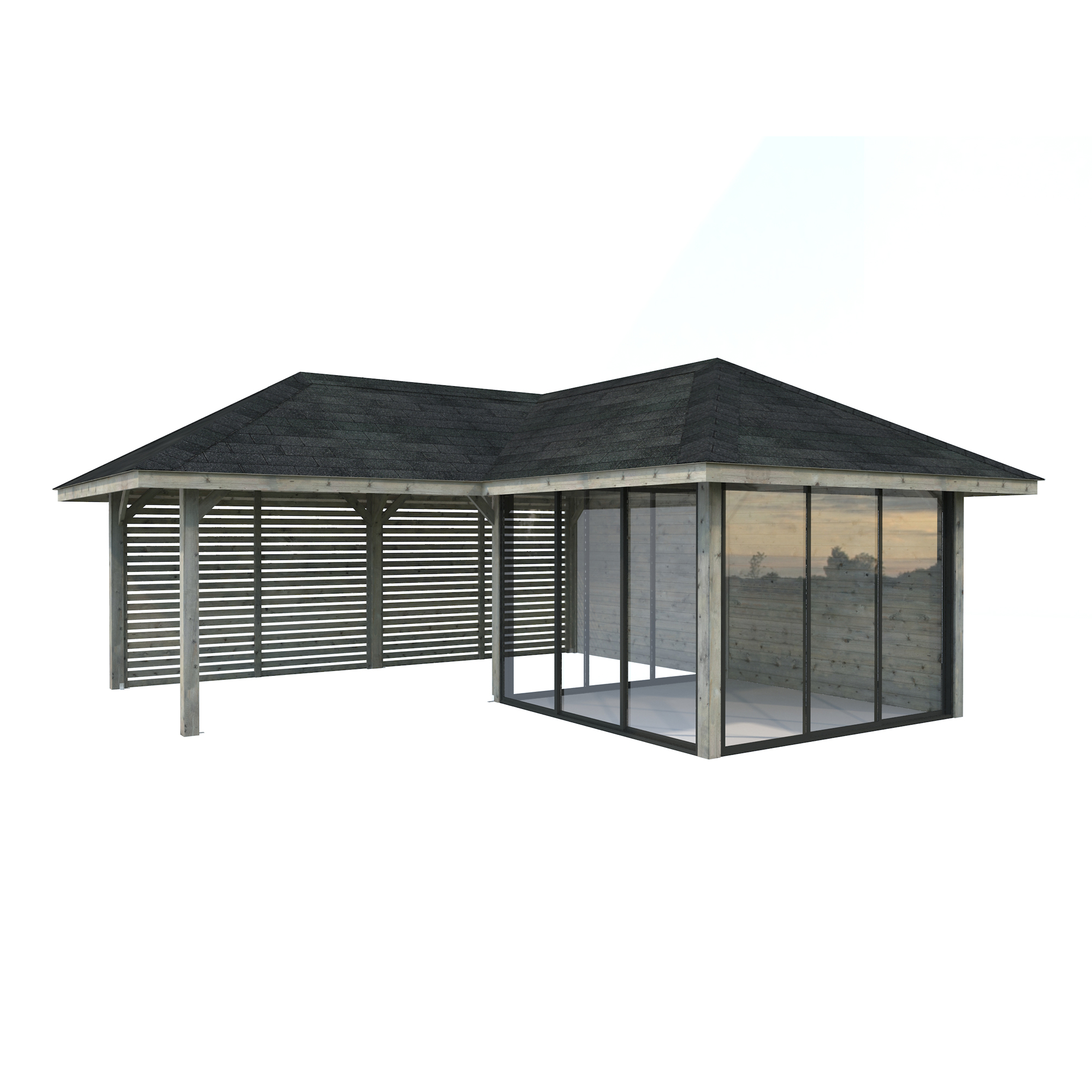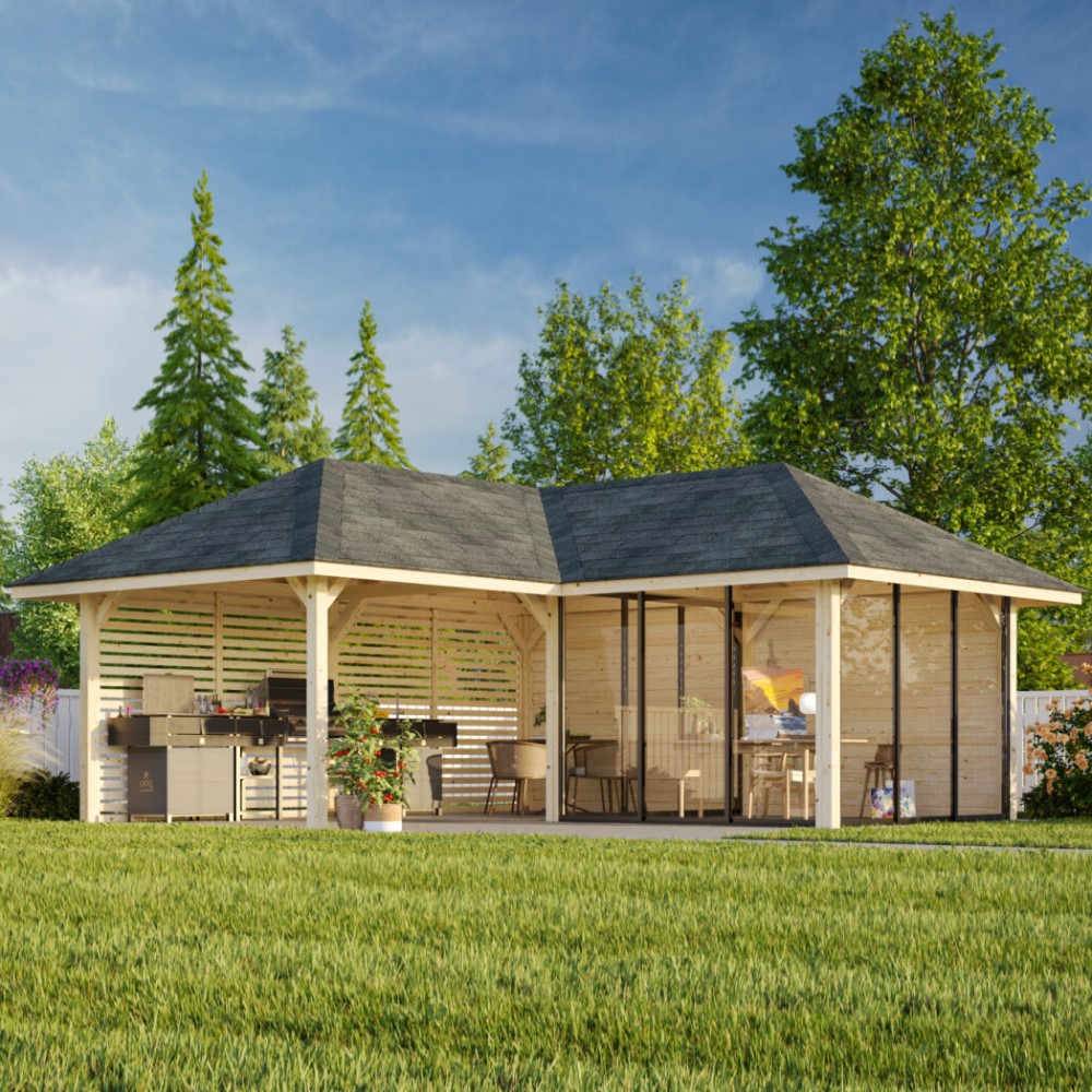 Tillverkad av nordisk gran med 120x120 mm starka limträstolpar och 19 mm takbrädor. Låsbara skjutdörrarna i 4 mm härdat glas och aluminium. 28 mm väggstockar.