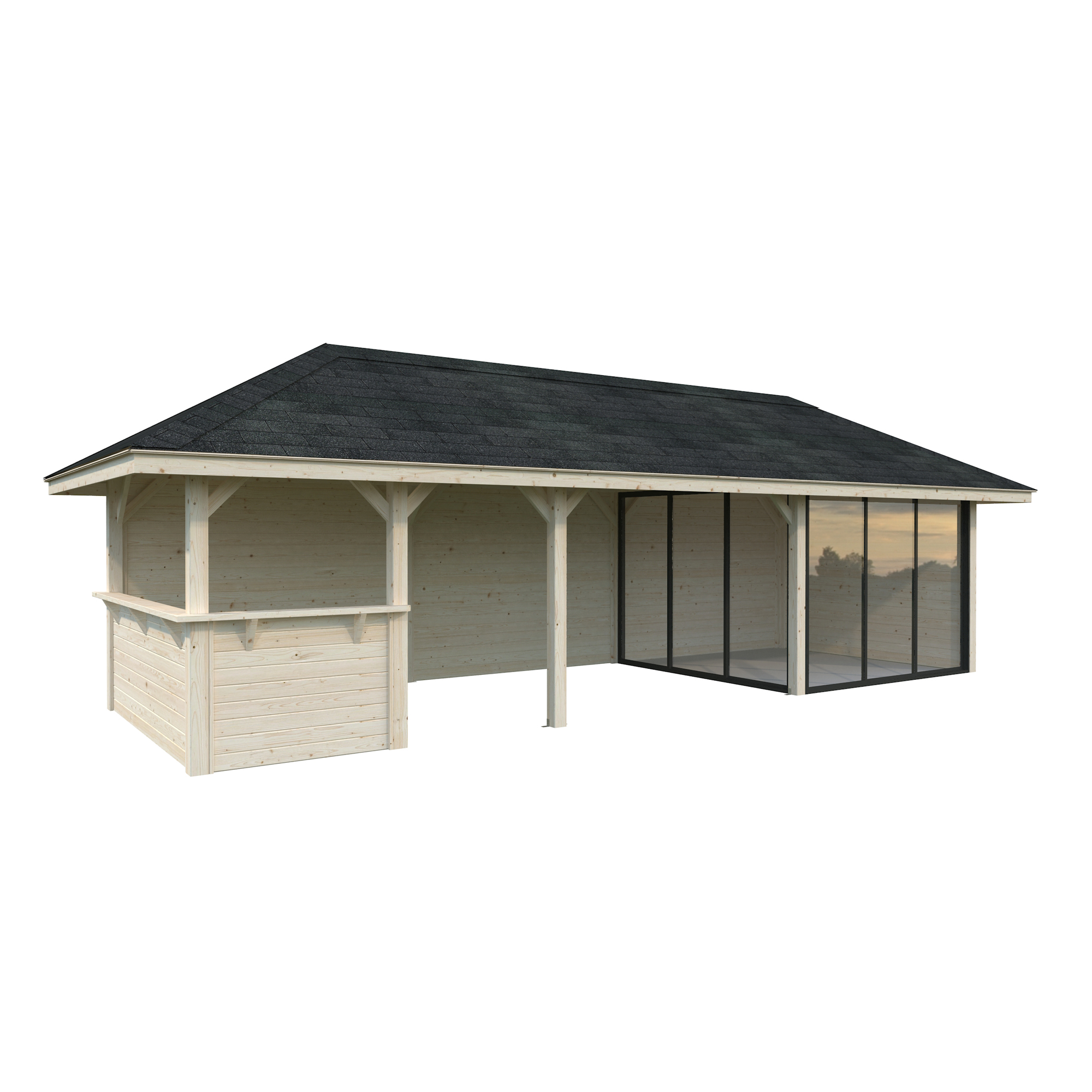 Tillverkad av nordisk gran med 120x120 mm starka limträstolpar och 19 mm takbrädor. Låsbara skjutdörrarna i 4 mm härdat glas och aluminium. 28 mm väggstockar.