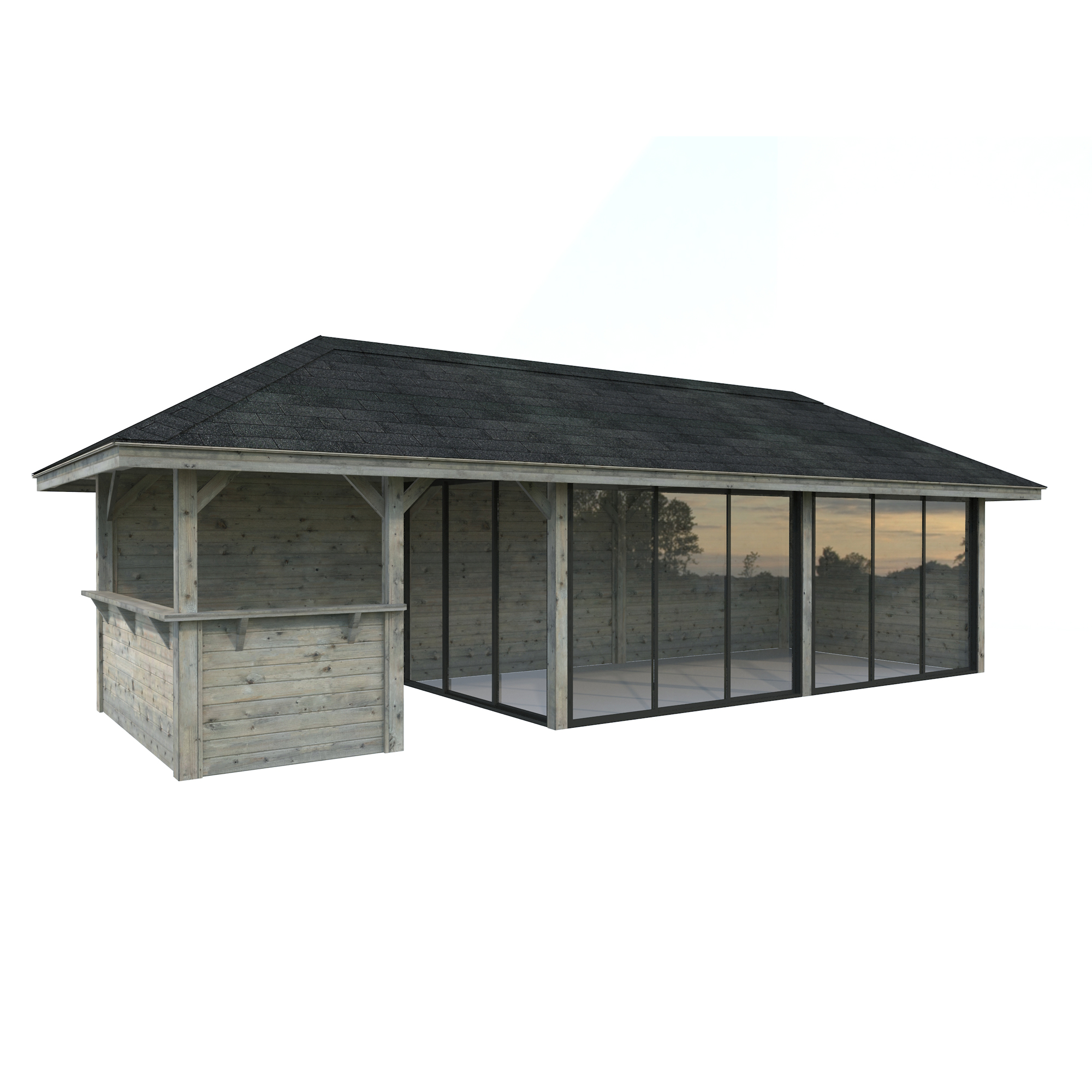 Tillverkad av nordisk gran med 120x120 mm starka limträstolpar och 19 mm takbrädor. Låsbara skjutdörrarna i 4 mm härdat glas och aluminium. 28 mm väggstockar.