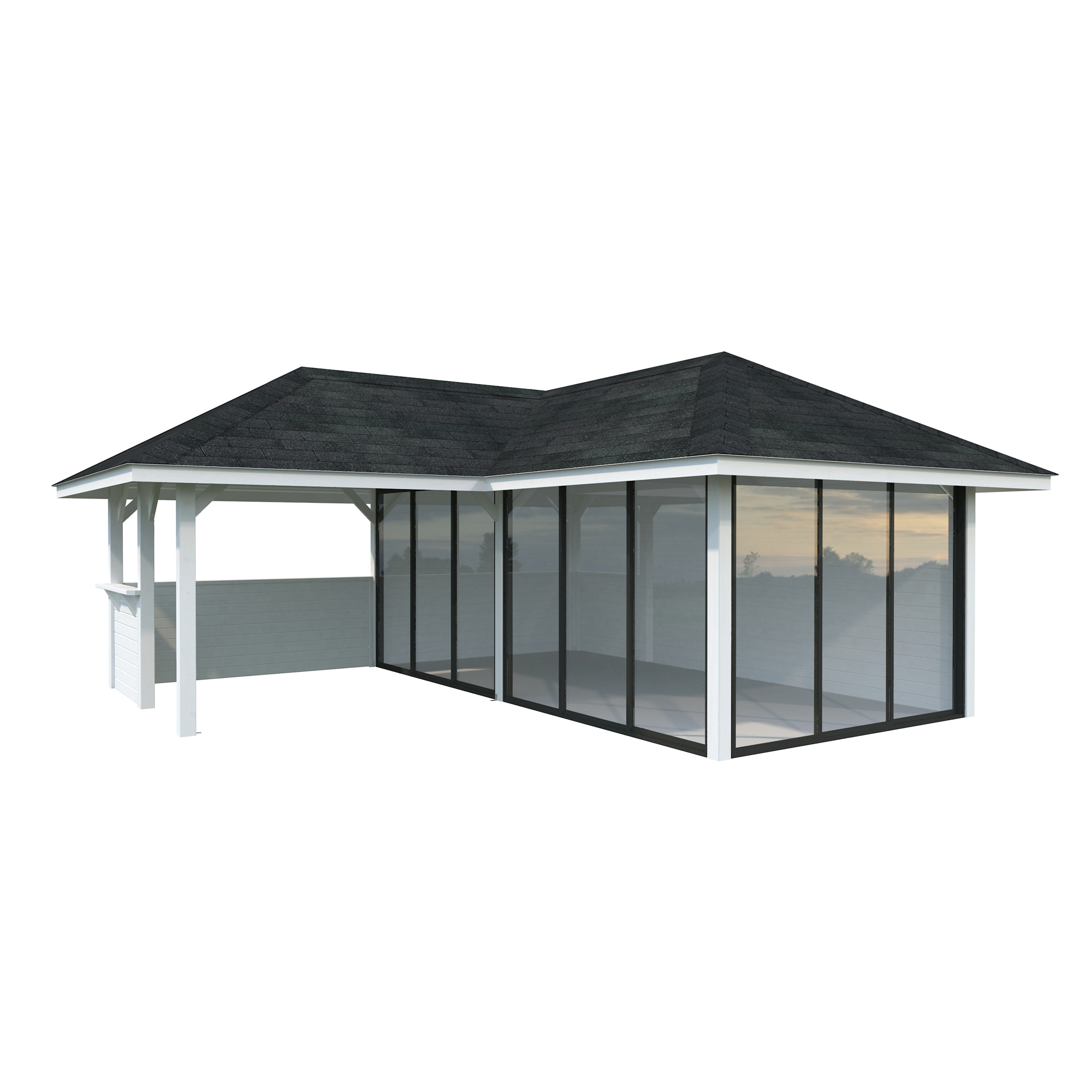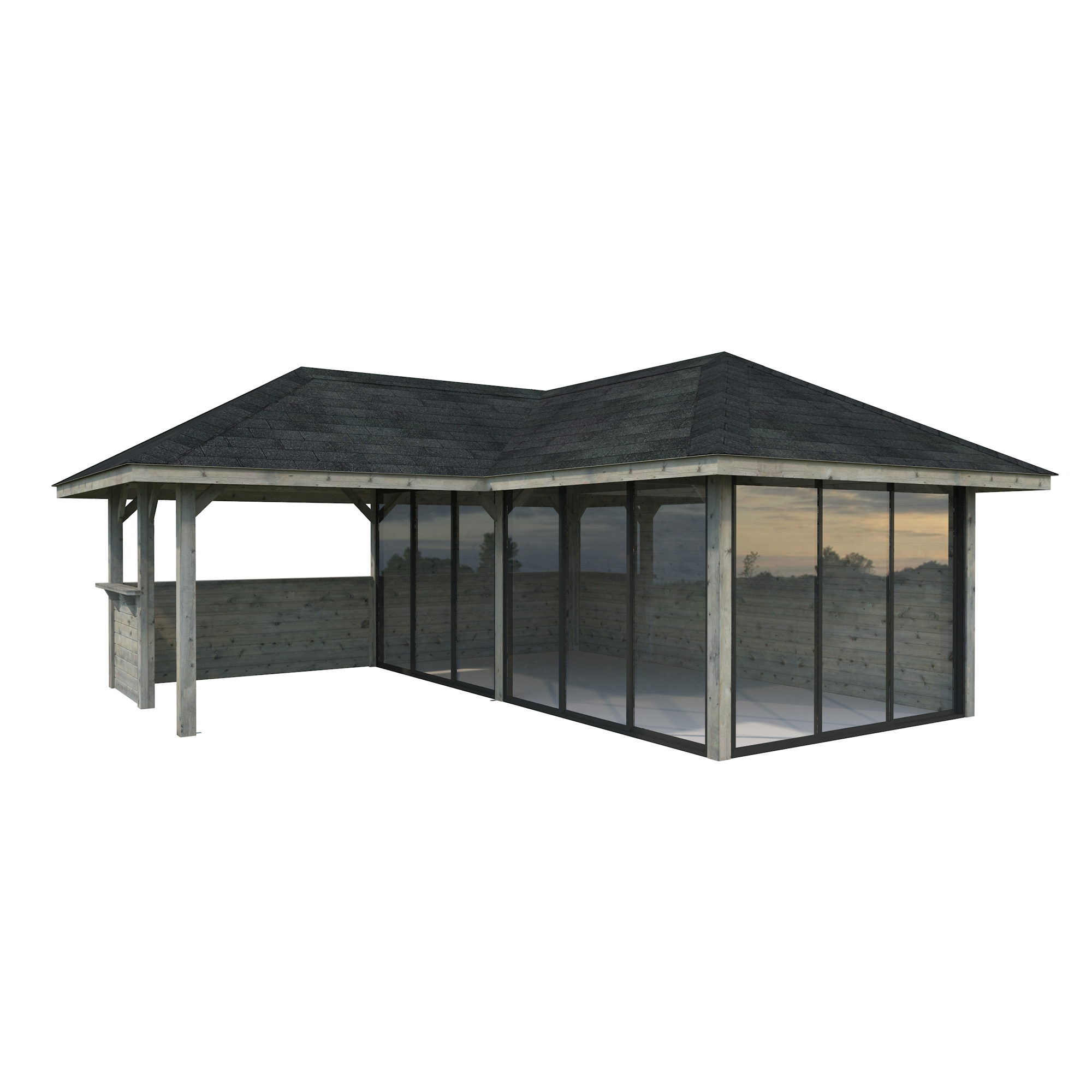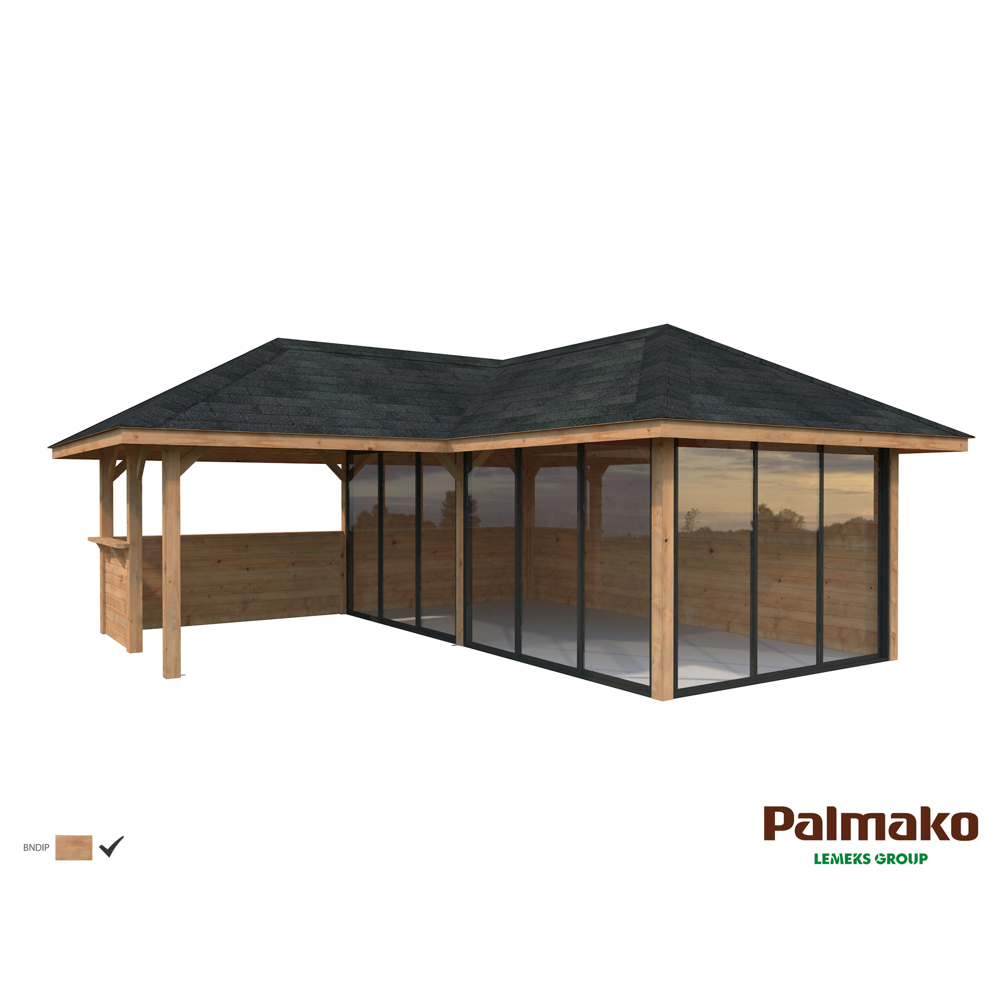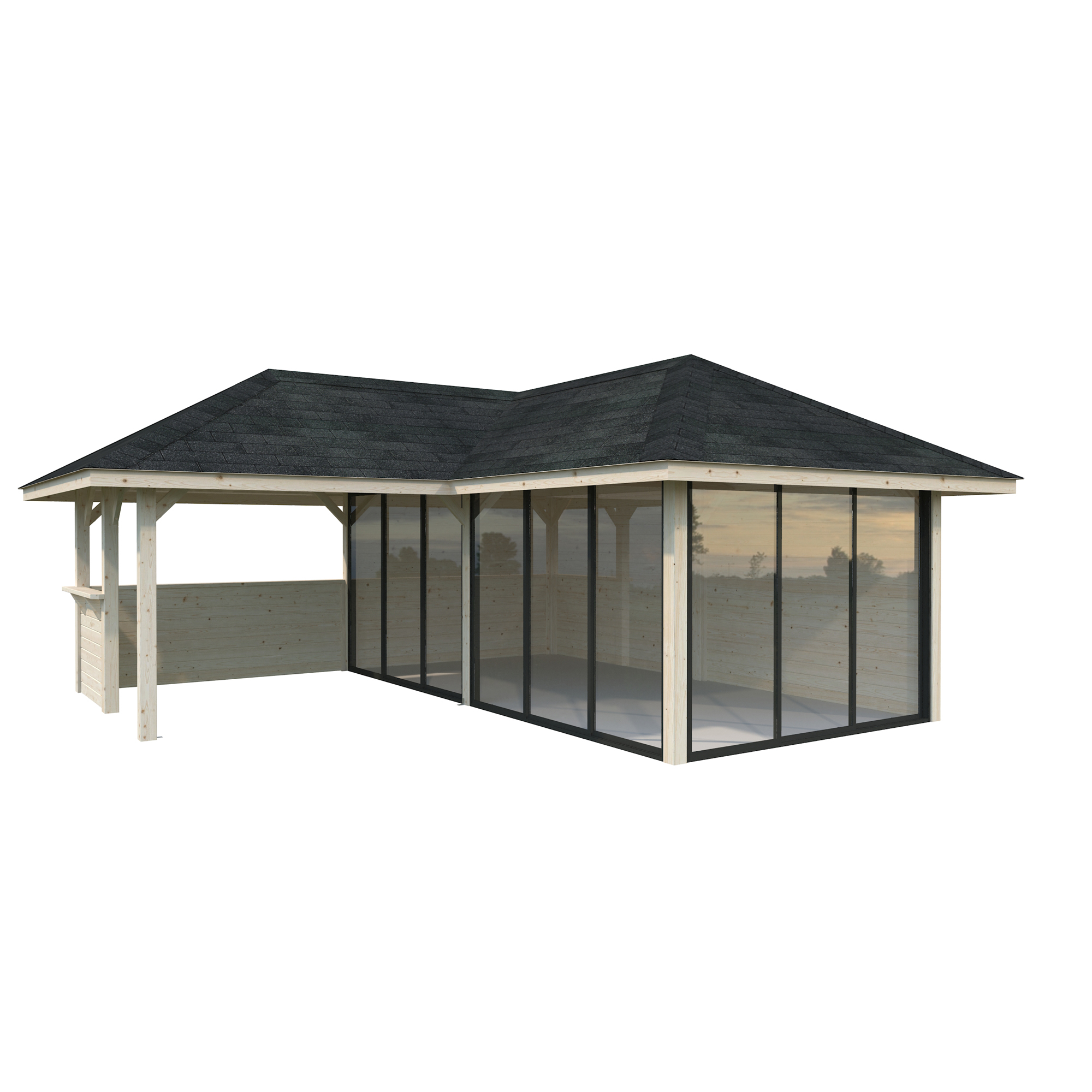 Tillverkad av nordisk gran med 120x120 mm starka limträstolpar och 19 mm takbrädor. Låsbara skjutdörrarna i 4 mm härdat glas och aluminium. 28 mm väggstockar.