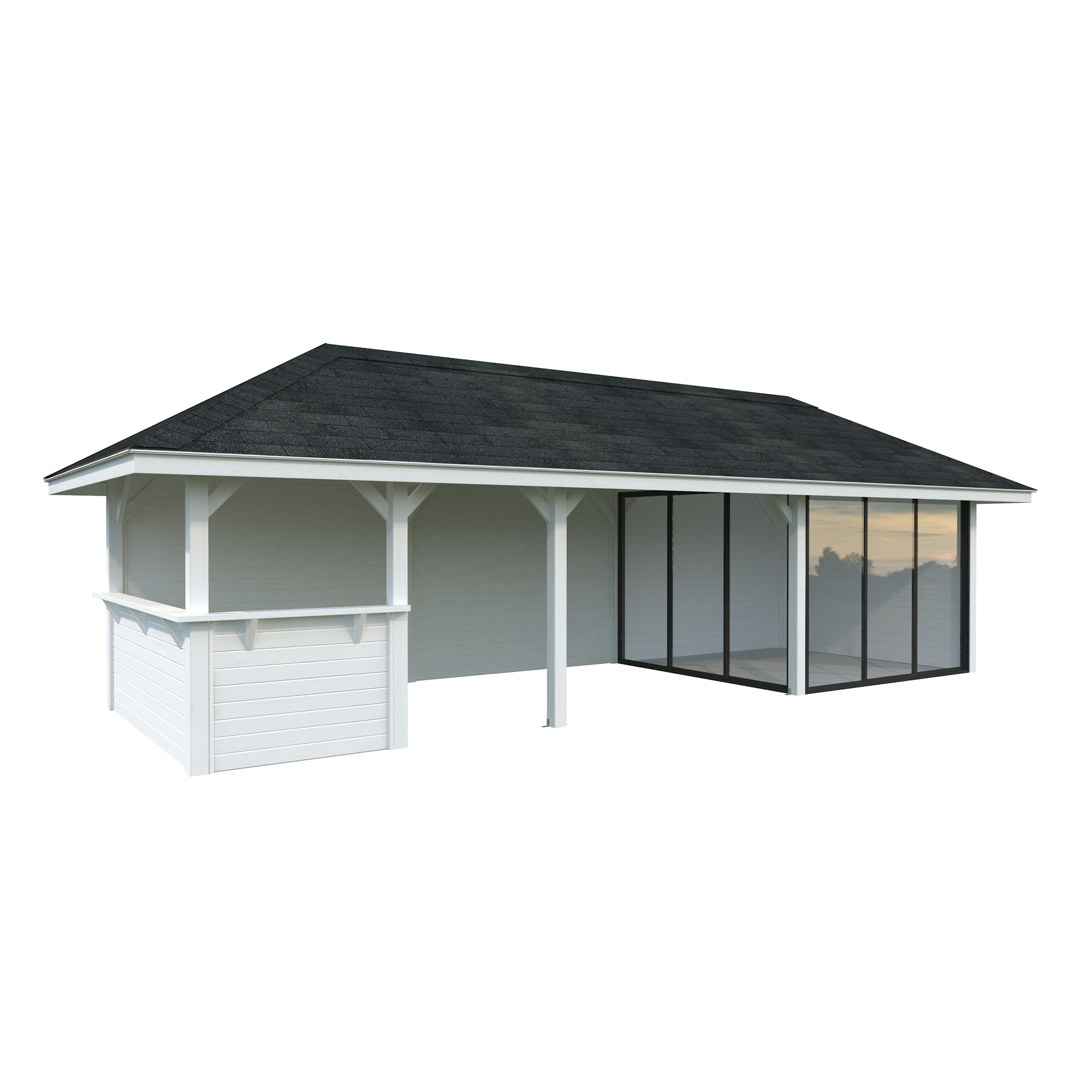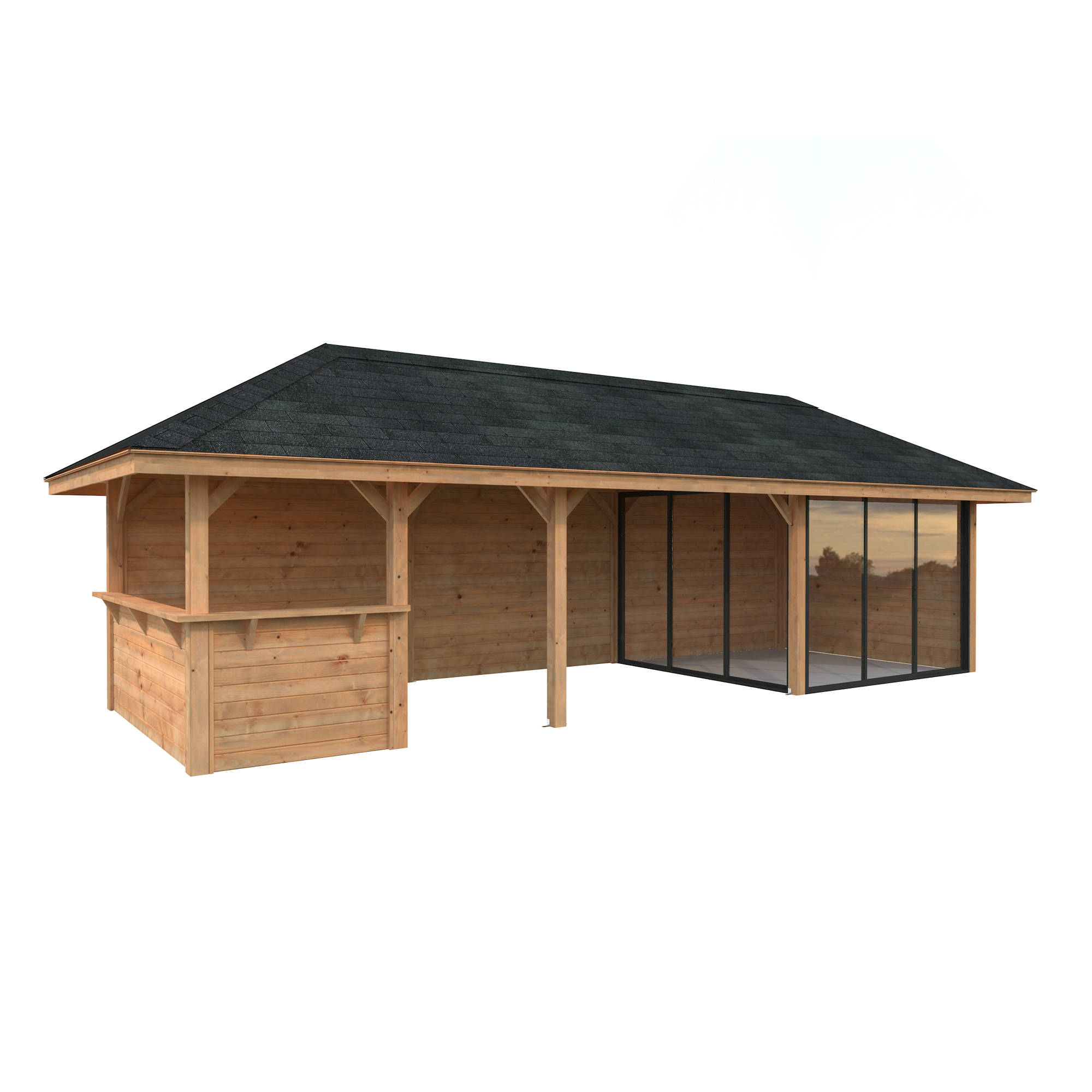 Tillverkad av nordisk gran med 120x120 mm starka limträstolpar och 19 mm takbrädor. Låsbara skjutdörrarna i 24 mm härdat dubbelglas (4 mm härdat glas - 16 mm luftspalt - 4 mm härdat glas) monterat i solida aluminiumprofiler. 28 mm väggstockar.
