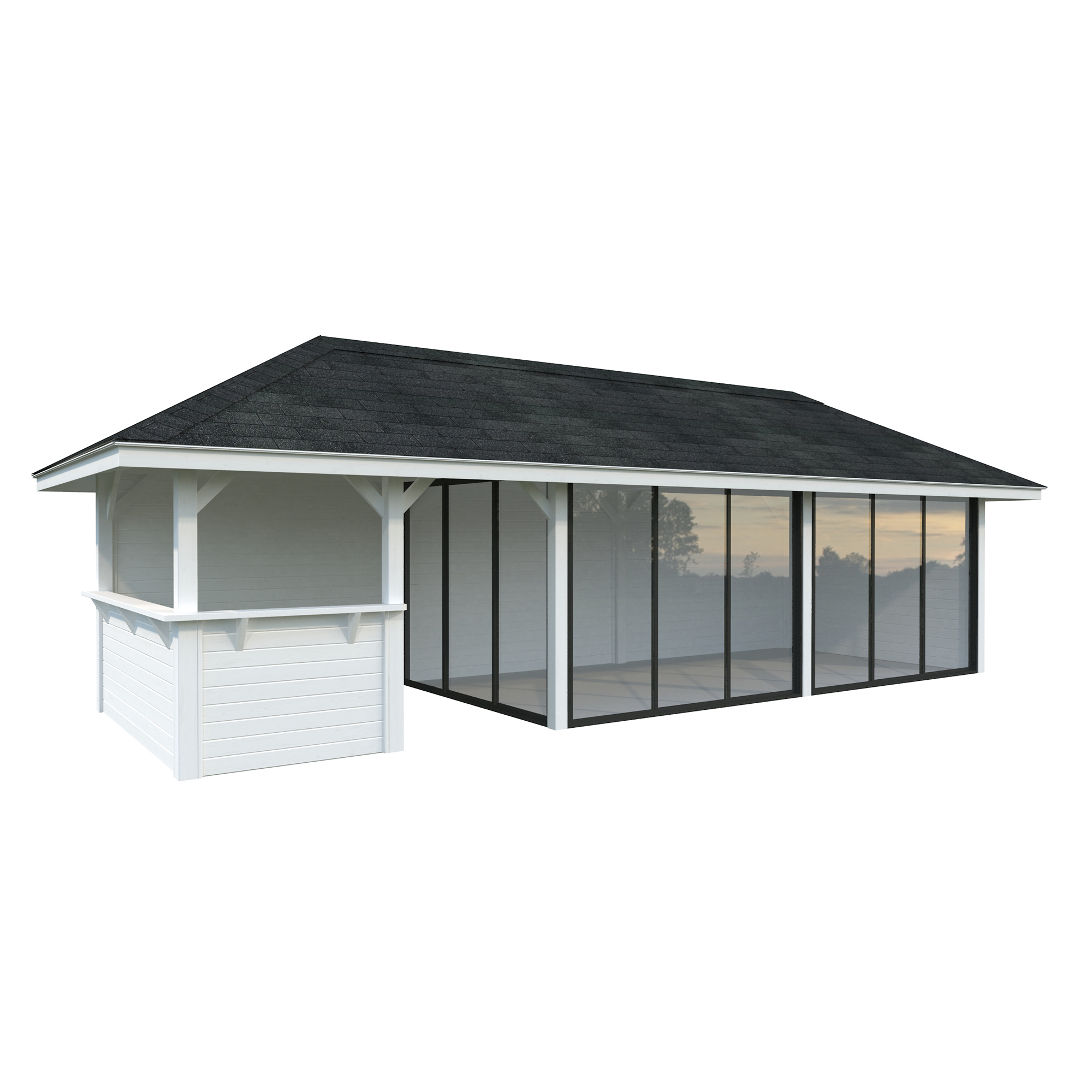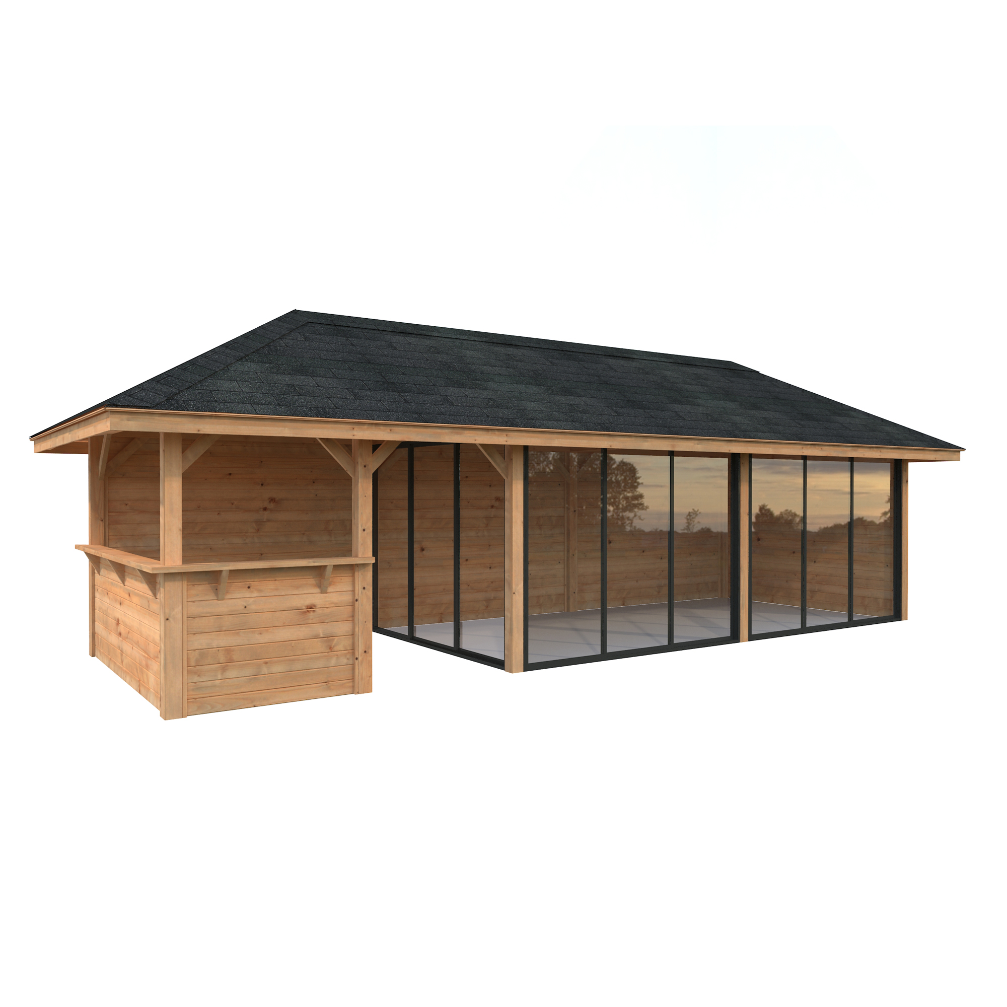 Tillverkad av nordisk gran med 120x120 mm starka limträstolpar och 19 mm takbrädor. Låsbara skjutdörrarna i 24 mm härdat dubbelglas (4 mm härdat glas - 16 mm luftspalt - 4 mm härdat glas) monterat i solida aluminiumprofiler. 28 mm väggstockar.