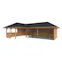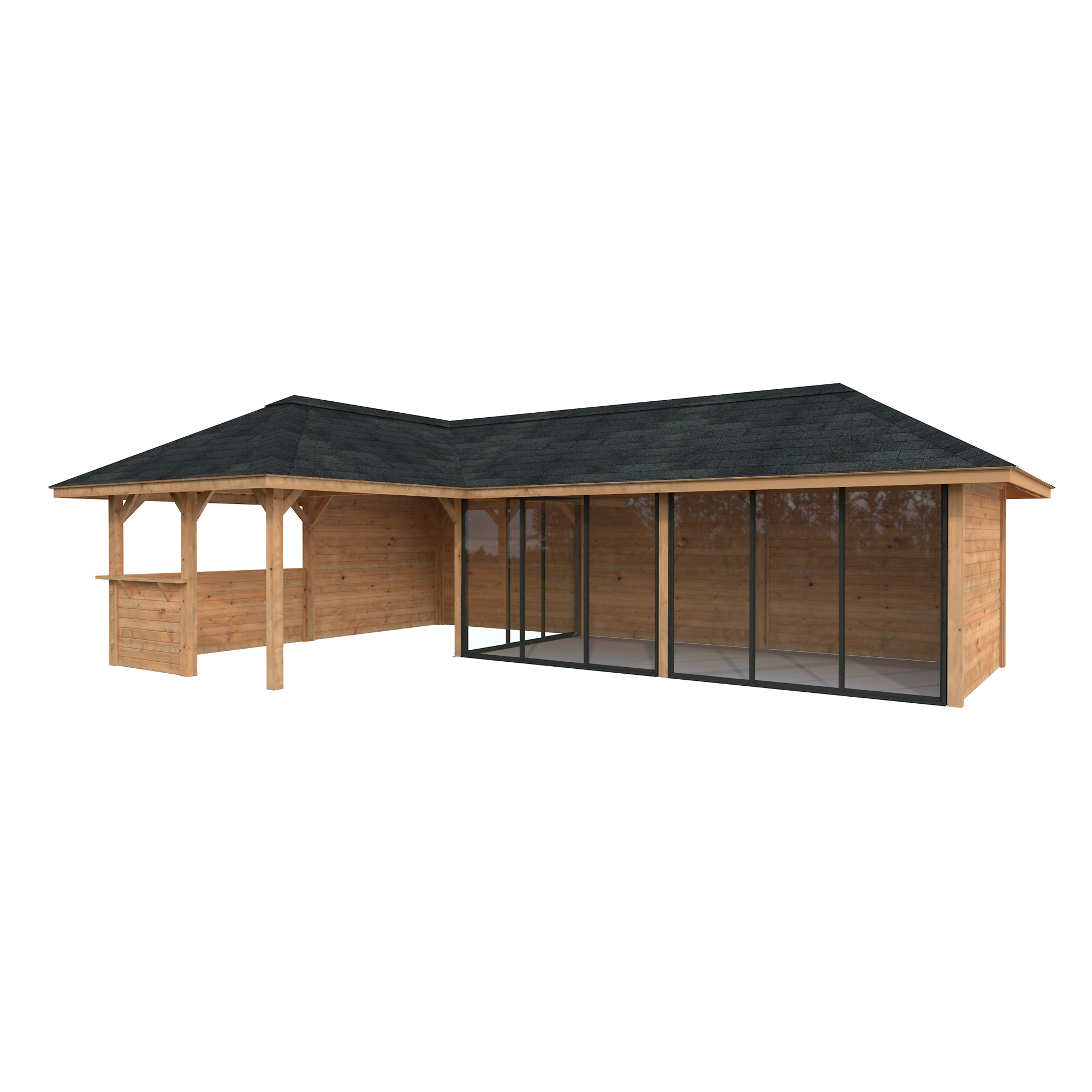 Tillverkad av nordisk gran med 120x120 mm starka limträstolpar och 19 mm takbrädor. Låsbara skjutdörrarna i 4 mm härdat glas och aluminium. 28 mm väggstockar.