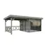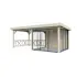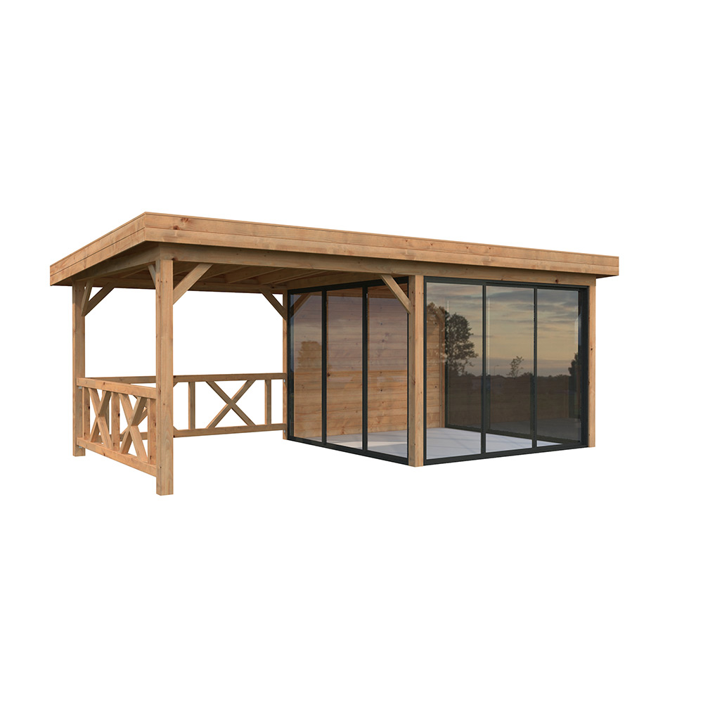 Tillverkad av nordisk gran med 120x120 mm starka limträstolpar och 19 mm takbrädor. Låsbara skjutdörrarna i 4 mm härdat glas och aluminium. 28 mm väggstockar.