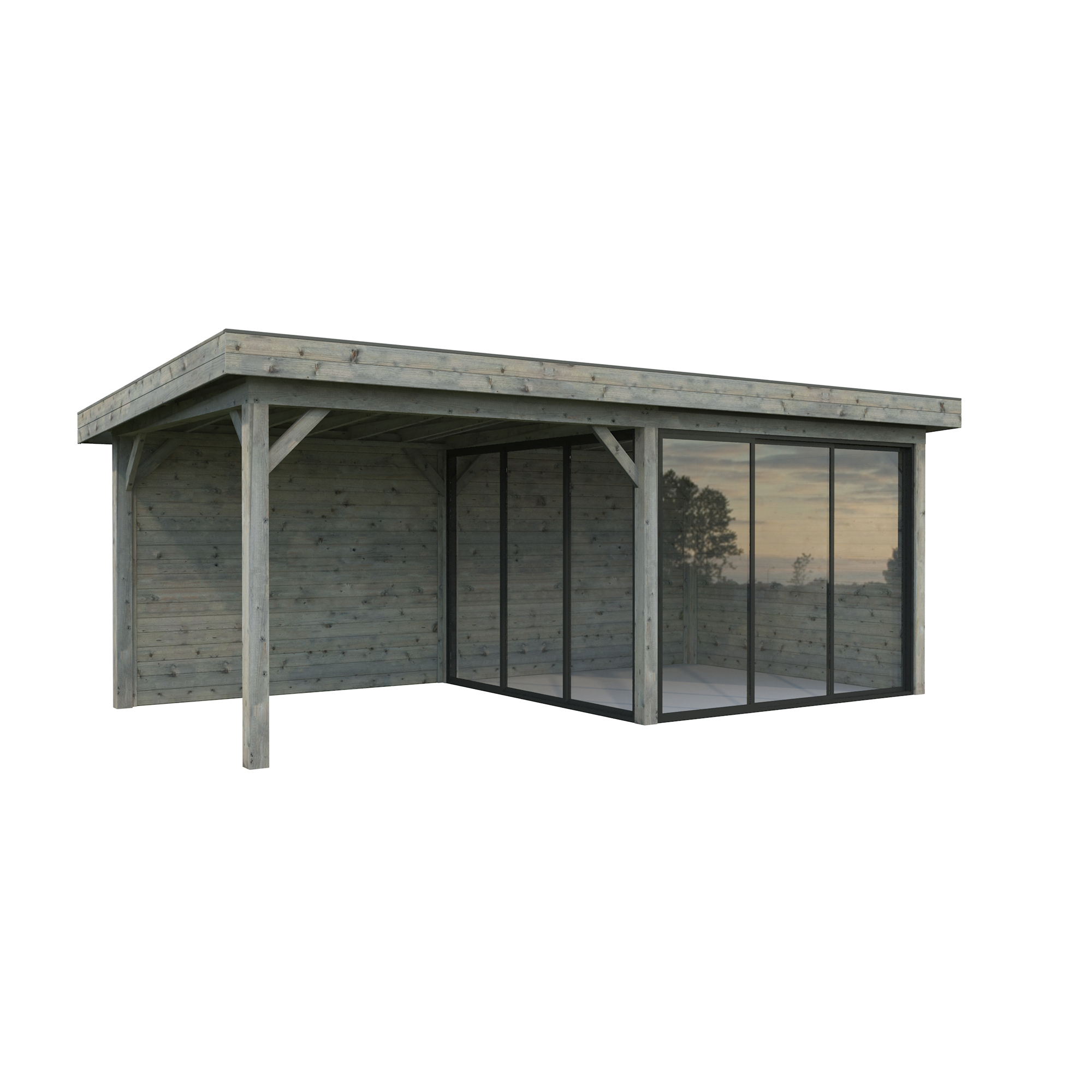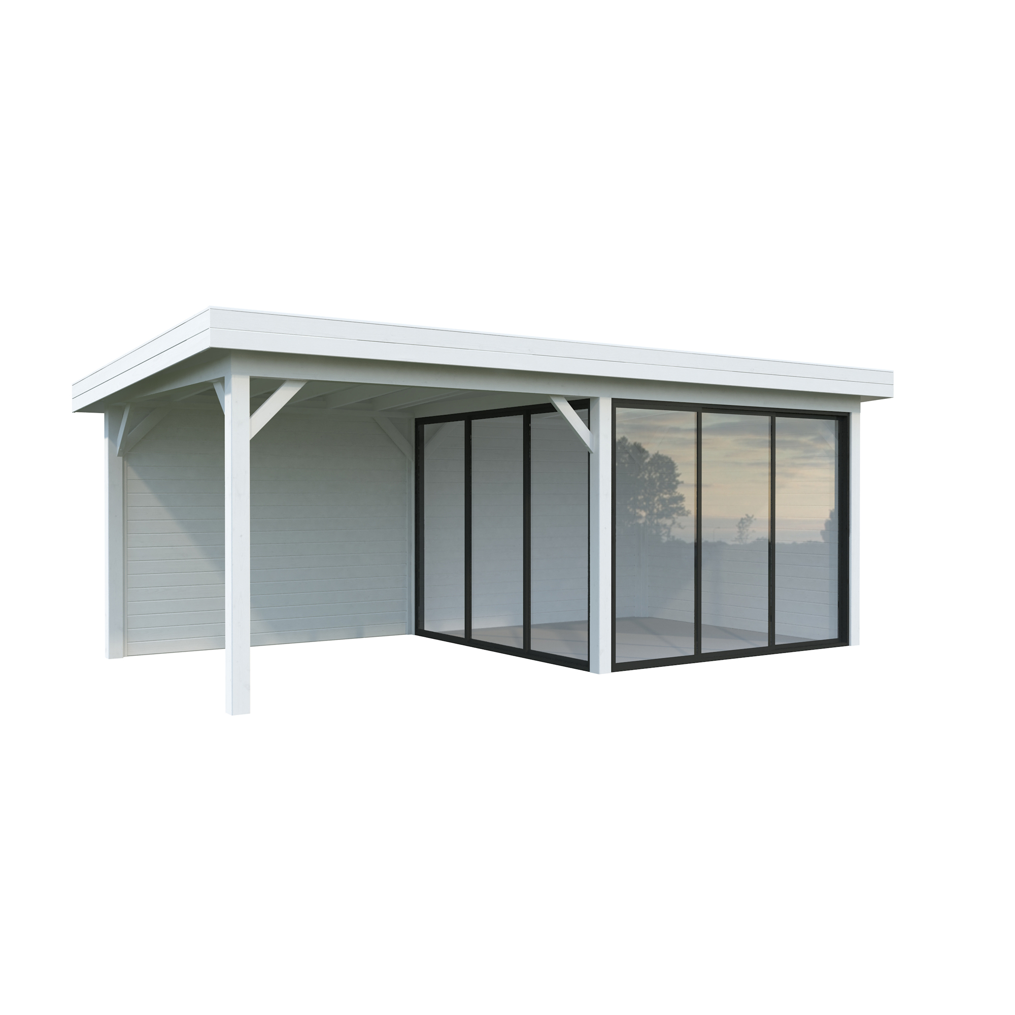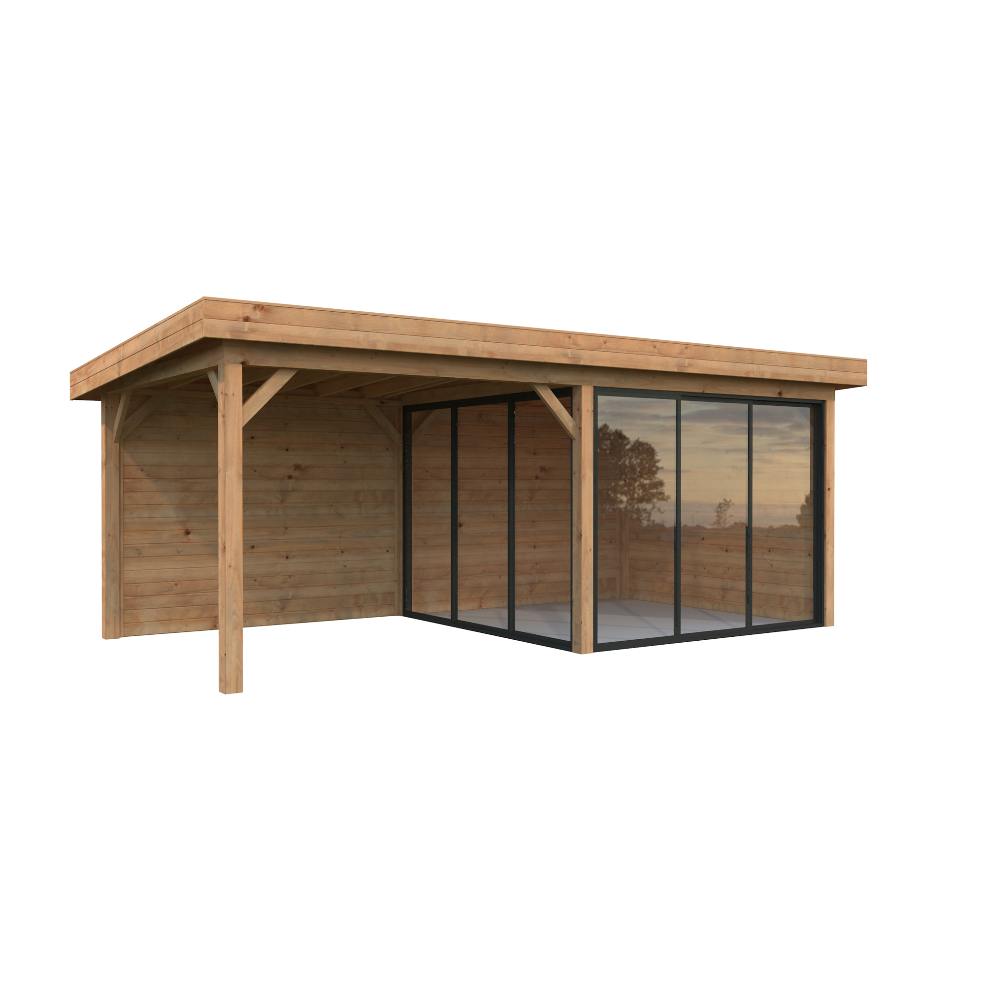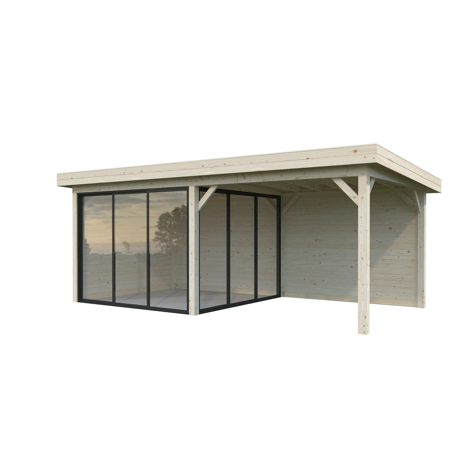 Tillverkad av nordisk gran med 120x120 mm starka limträstolpar och 19 mm takbrädor. Låsbara skjutdörrarna i 24 mm härdat dubbelglas (4 mm härdat glas - 16 mm luftspalt - 4 mm härdat glas) monterat i solida aluminiumprofiler. 28 mm väggstockar.