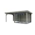 Tillverkad av nordisk gran med 120x120 mm starka limträstolpar och 19 mm takbrädor. Låsbara skjutdörrarna i 24 mm härdat dubbelglas (4 mm härdat glas - 16 mm luftspalt - 4 mm härdat glas) monterat i solida aluminiumprofiler. 28 mm väggstockar.