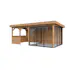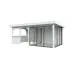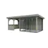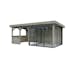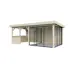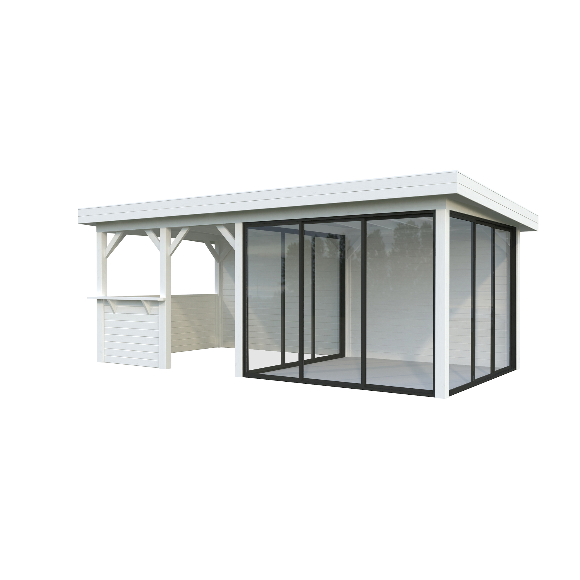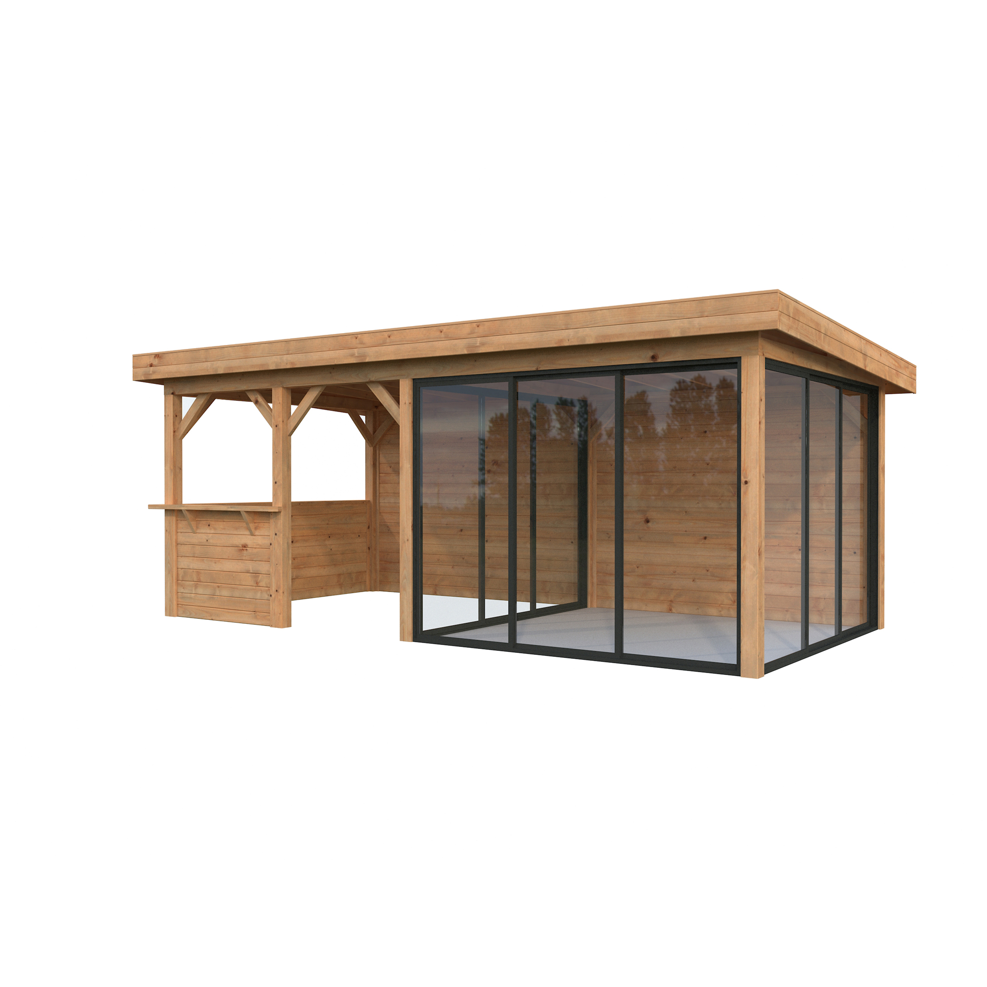 Tillverkad av nordisk gran med 120x120 mm starka limträstolpar och 19 mm takbrädor. Låsbara skjutdörrarna i 24 mm härdat dubbelglas (4 mm härdat glas - 16 mm luftspalt - 4 mm härdat glas) monterat i solida aluminiumprofiler. 28 mm väggstockar.