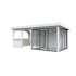 Tillverkad av nordisk gran med 120x120 mm starka limträstolpar och 19 mm takbrädor. Låsbara skjutdörrarna i 4 mm härdat glas och aluminium. 28 mm väggstockar.