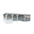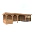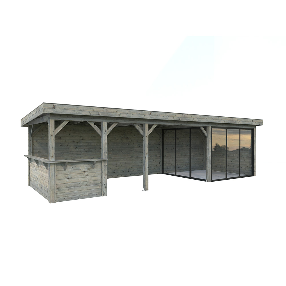 Tillverkad av nordisk gran med 120x120 mm starka limträstolpar och 19 mm takbrädor. Låsbara skjutdörrarna i 4 mm härdat glas och aluminium. 28 mm väggstockar. Jalusivägg.