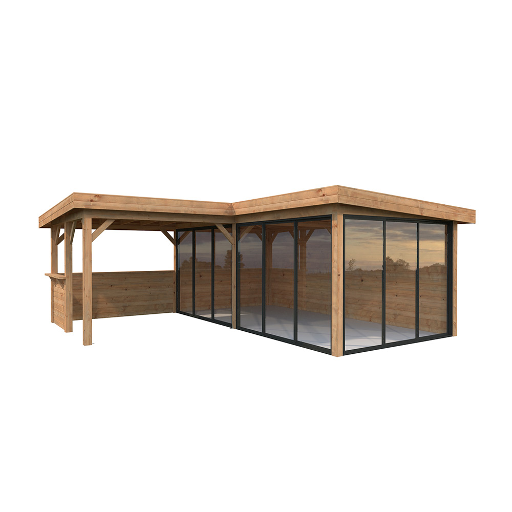 Tillverkad av nordisk gran med 120x120 mm starka limträstolpar och 19 mm takbrädor. Låsbara skjutdörrarna i 4 mm härdat glas och aluminium. 28 mm väggstockar.