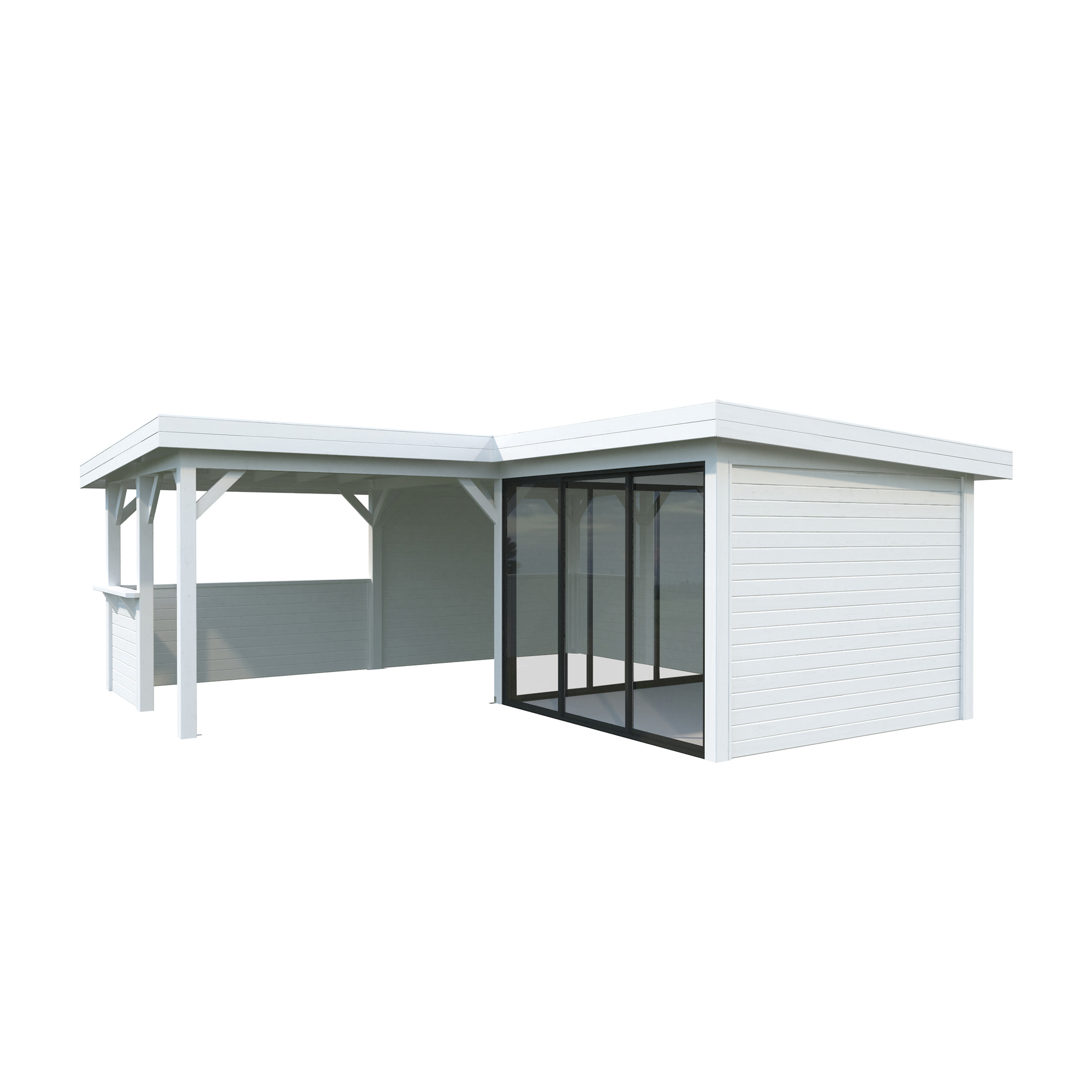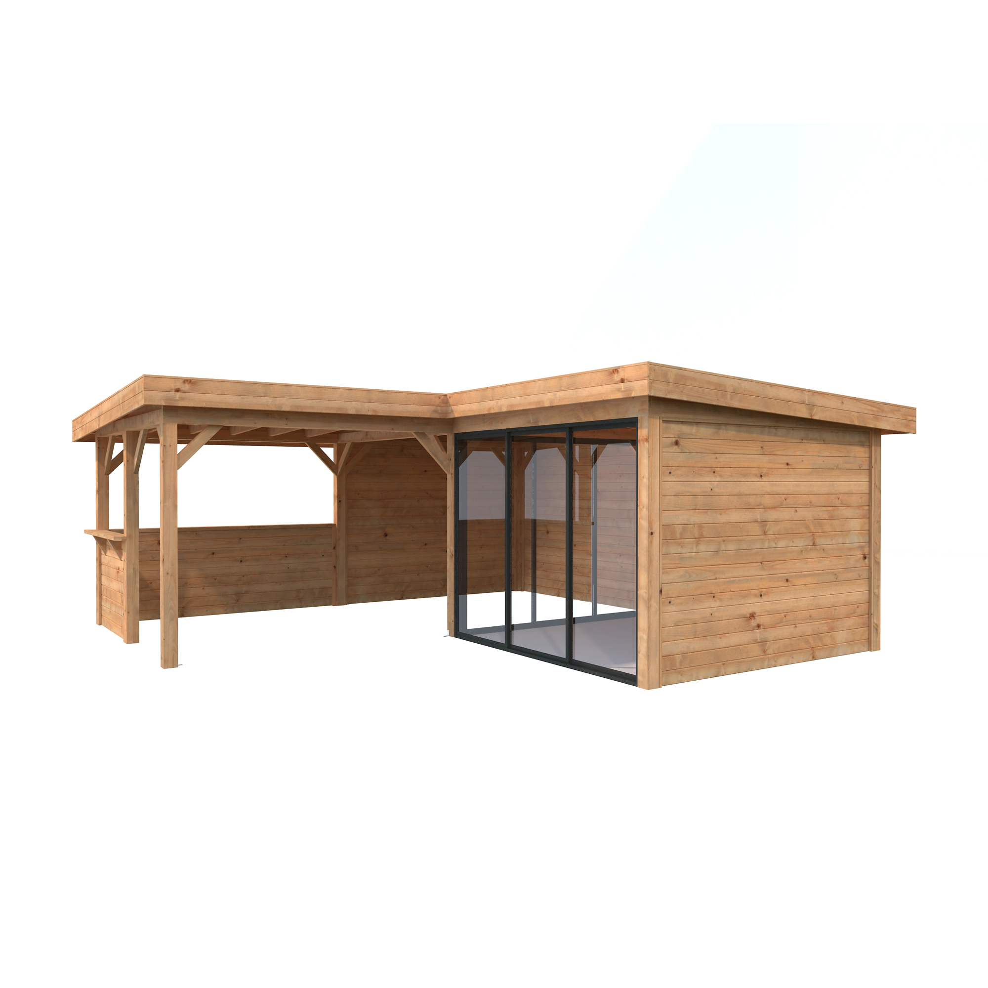 Tillverkad av nordisk gran med 120x120 mm starka limträstolpar och 19 mm takbrädor. Låsbara skjutdörrarna i 24 mm härdat dubbelglas (4 mm härdat glas - 16 mm luftspalt - 4 mm härdat glas) monterat i solida aluminiumprofiler. 28 mm väggstockar.