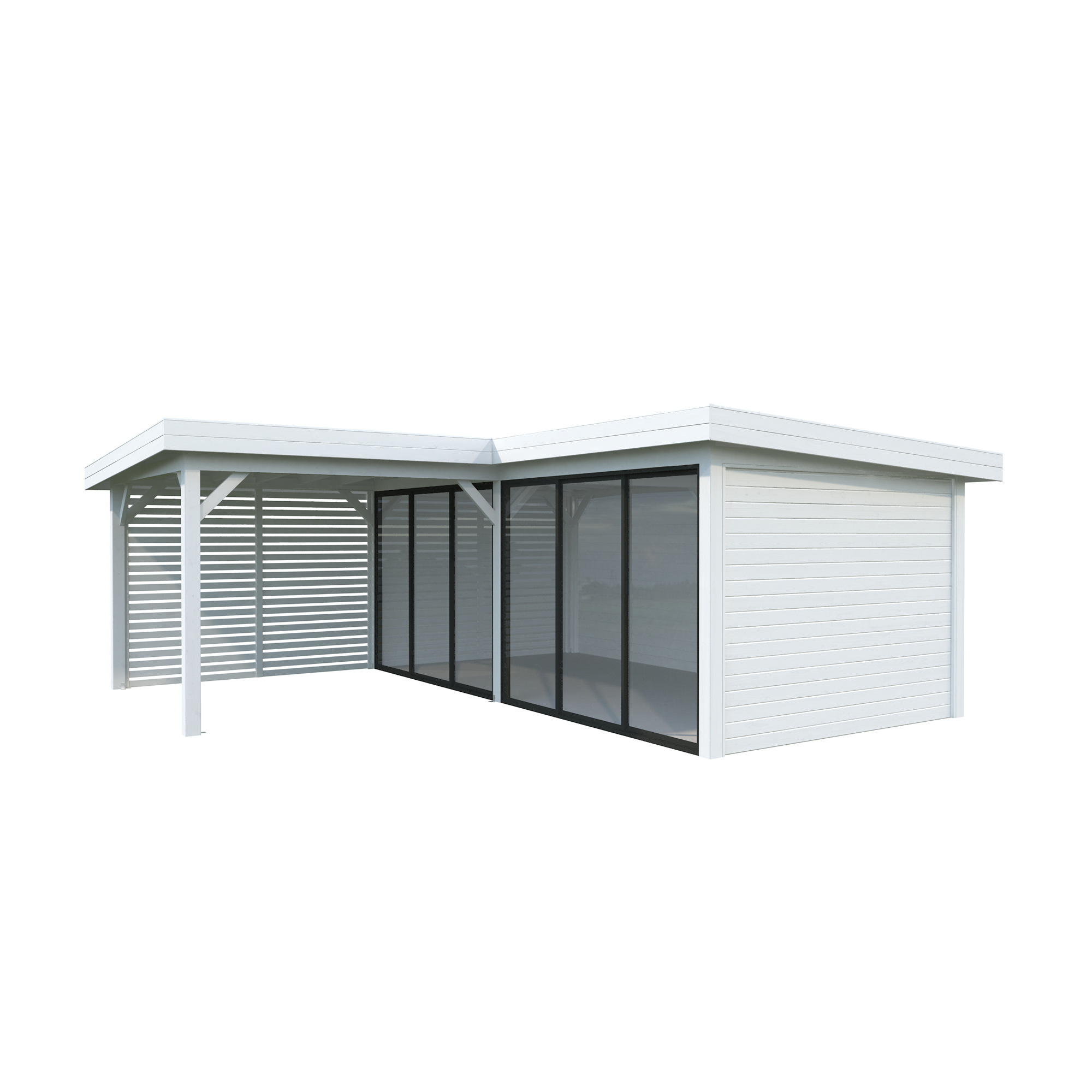 Taktäckning, golv och träbalksgrund ingår inte men kan köpas som tillval.