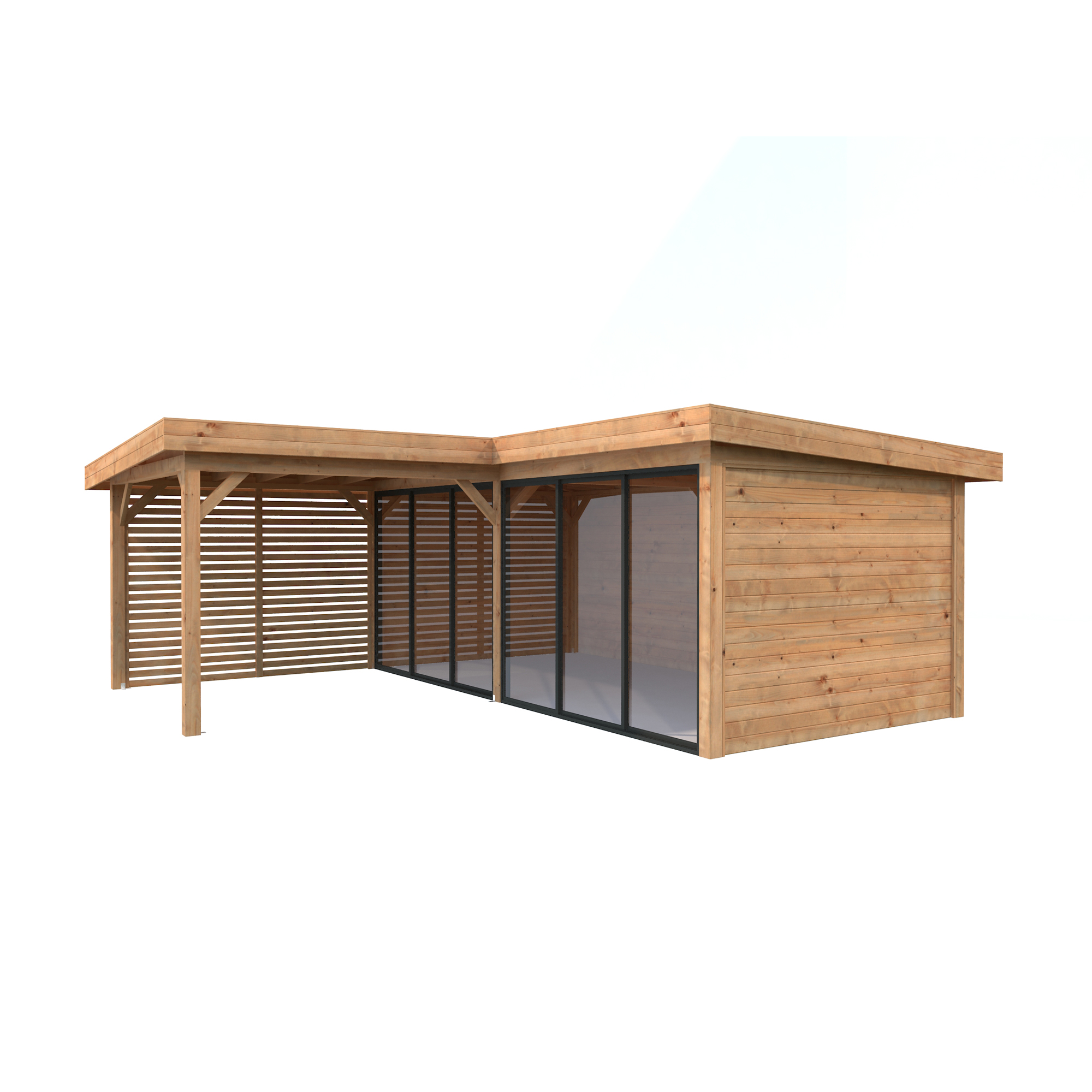 Tillverkad av nordisk gran med 120x120 mm starka limträstolpar och 19 mm takbrädor. Låsbara skjutdörrarna i 24 mm härdat dubbelglas (4 mm härdat glas - 16 mm luftspalt - 4 mm härdat glas) monterat i solida aluminiumprofiler. 28 mm väggstockar.