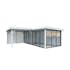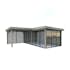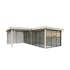 Tillverkad av nordisk gran med 120x120 mm starka limträstolpar och 19 mm takbrädor. Låsbara skjutdörrarna i 24 mm härdat dubbelglas (4 mm härdat glas - 16 mm luftspalt - 4 mm härdat glas) monterat i solida aluminiumprofiler. 28 mm väggstockar.