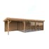 Tillverkad av nordisk gran med 120x120 mm starka limträstolpar och 19 mm takbrädor. Låsbara skjutdörrarna i 24 mm härdat dubbelglas (4 mm härdat glas - 16 mm luftspalt - 4 mm härdat glas) monterat i solida aluminiumprofiler. 28 mm väggstockar.