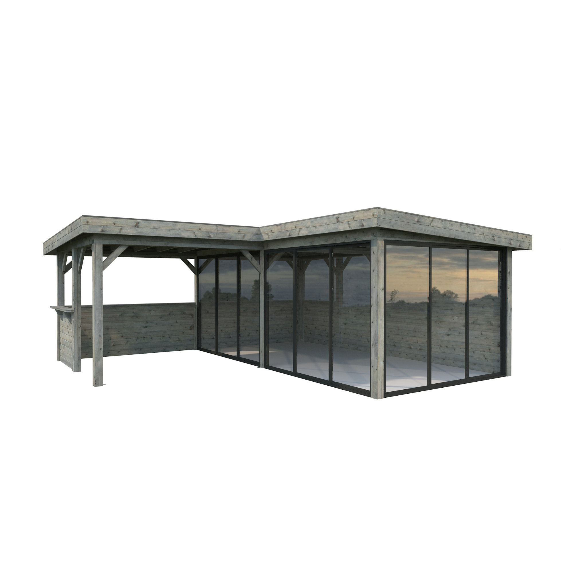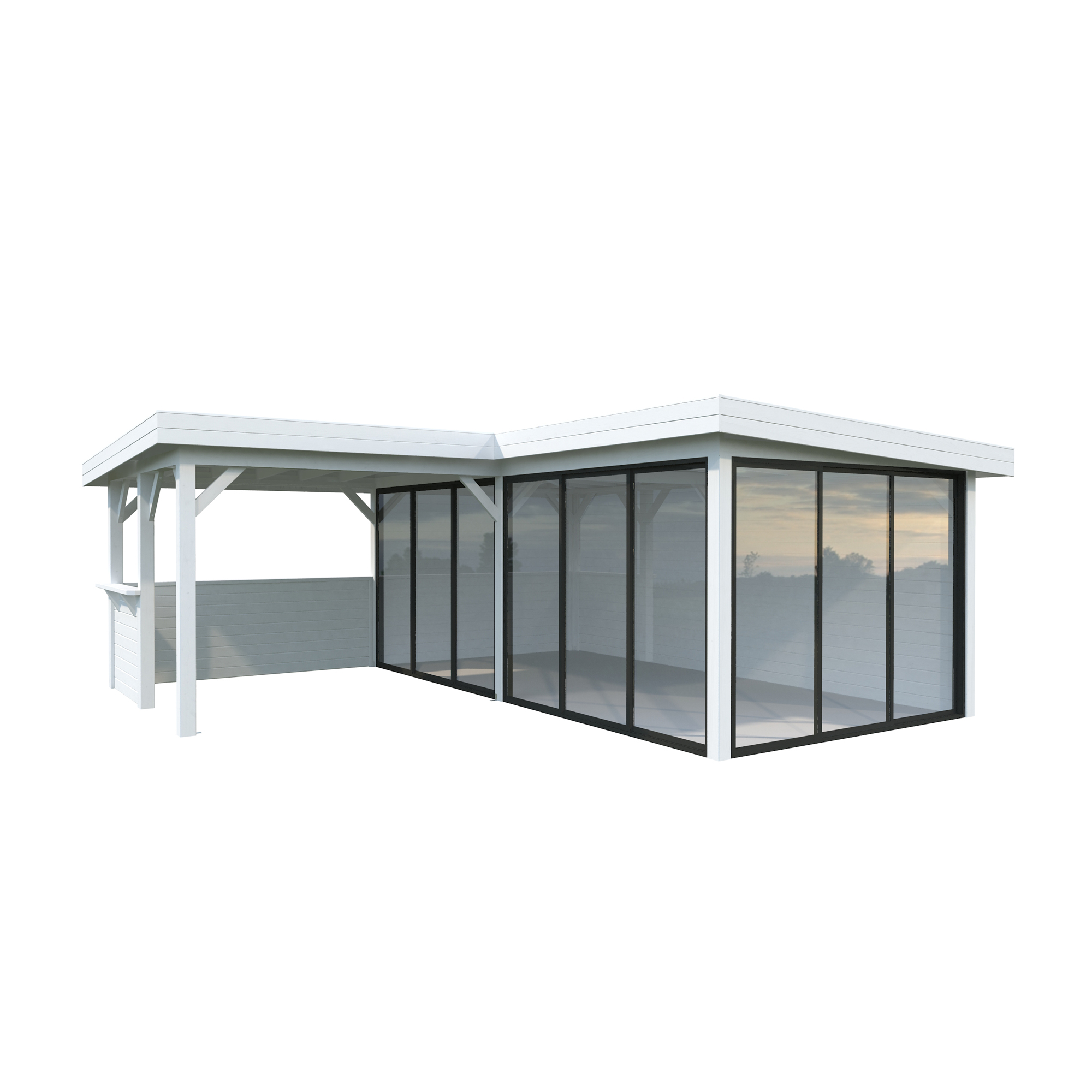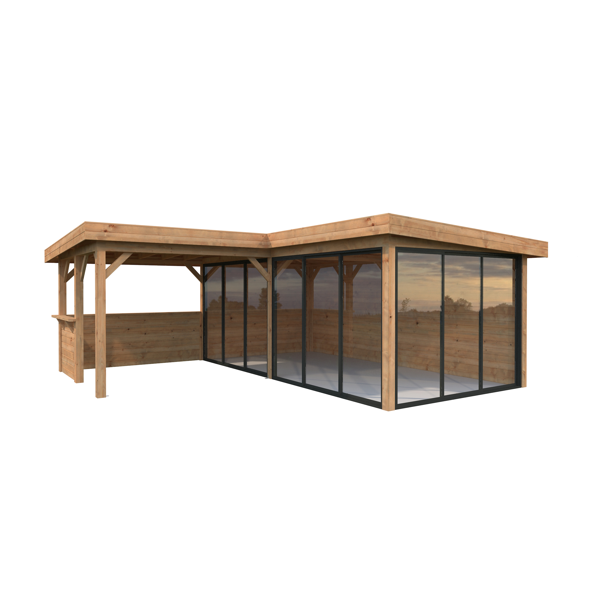 Tillverkad av nordisk gran med 120x120 mm starka limträstolpar och 19 mm takbrädor. Låsbara skjutdörrarna i 24 mm härdat dubbelglas (4 mm härdat glas - 16 mm luftspalt - 4 mm härdat glas) monterat i solida aluminiumprofiler. 28 mm väggstockar.