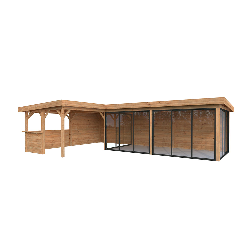 Tillverkad av nordisk gran med 120x120 mm starka limträstolpar och 19 mm takbrädor. Låsbara skjutdörrarna i 4 mm härdat glas och aluminium. 28 mm väggstockar.