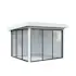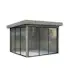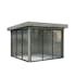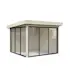 Tillverkad av nordisk gran med 120x120 mm starka limträstolpar och 19 mm takbrädor. Låsbara skjutdörrarna i 4 mm härdat glas och aluminium. 28 mm väggstockar.