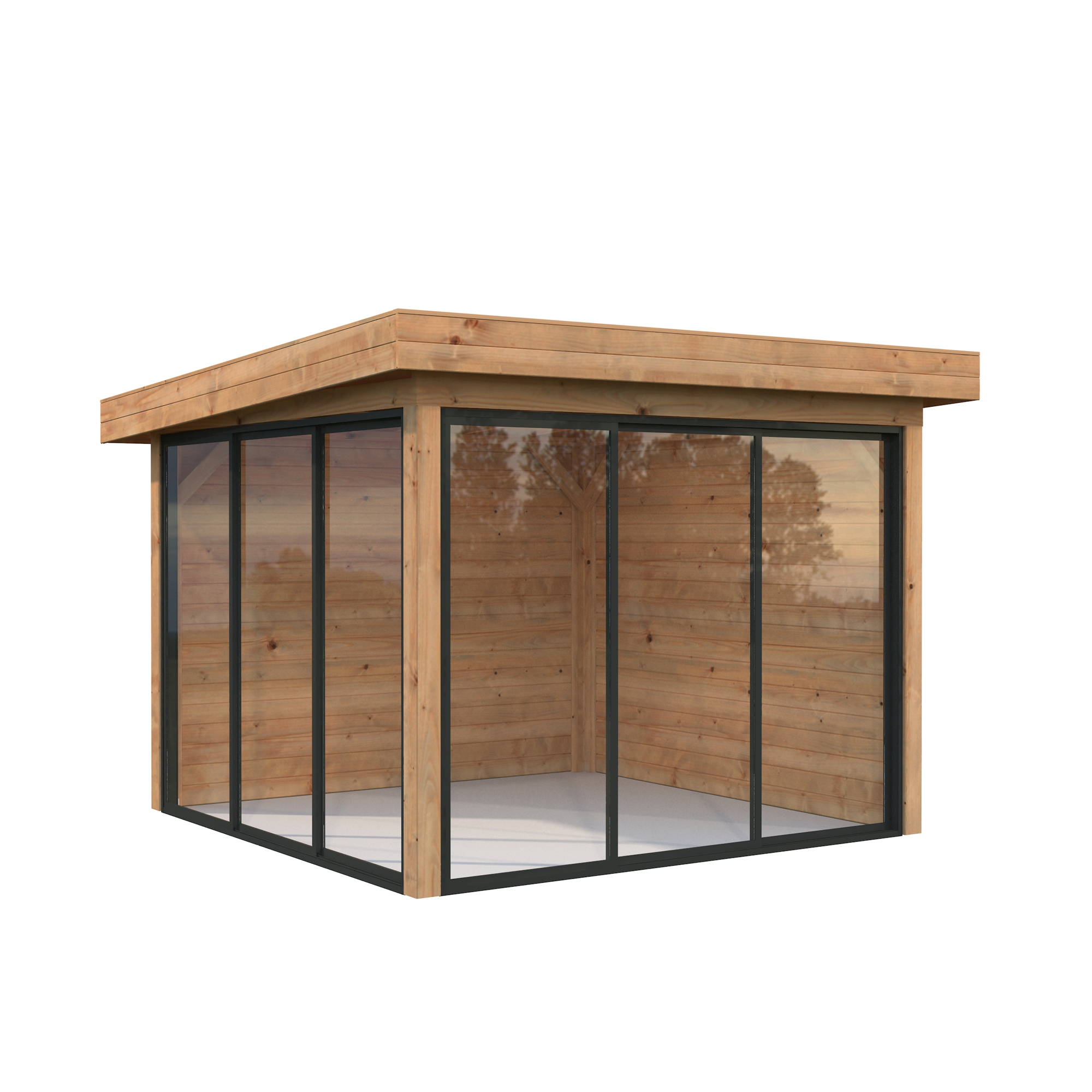 Tillverkad av nordisk gran med 120x120 mm starka limträstolpar och 19 mm takbrädor. Låsbara skjutdörrarna i 24 mm härdat dubbelglas (4 mm härdat glas - 16 mm luftspalt - 4 mm härdat glas) monterat i solida aluminiumprofiler. 28 mm väggstockar.