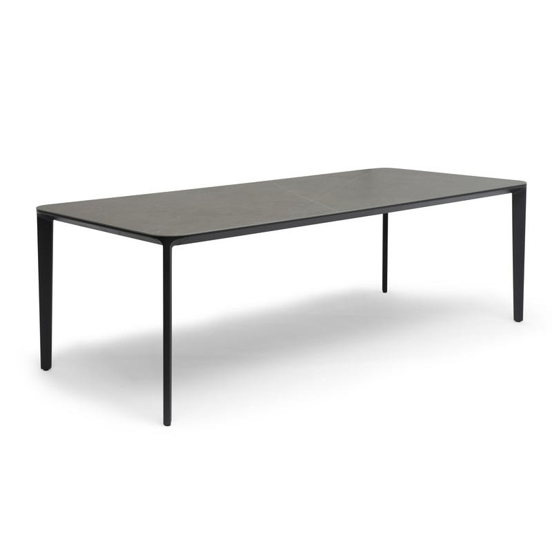 Elegant och modernt allround bord i mjukt rundat formspråk. Tillverkad i pulverlackad aluminium och bordsskiva i marmorerad keramisk glas.