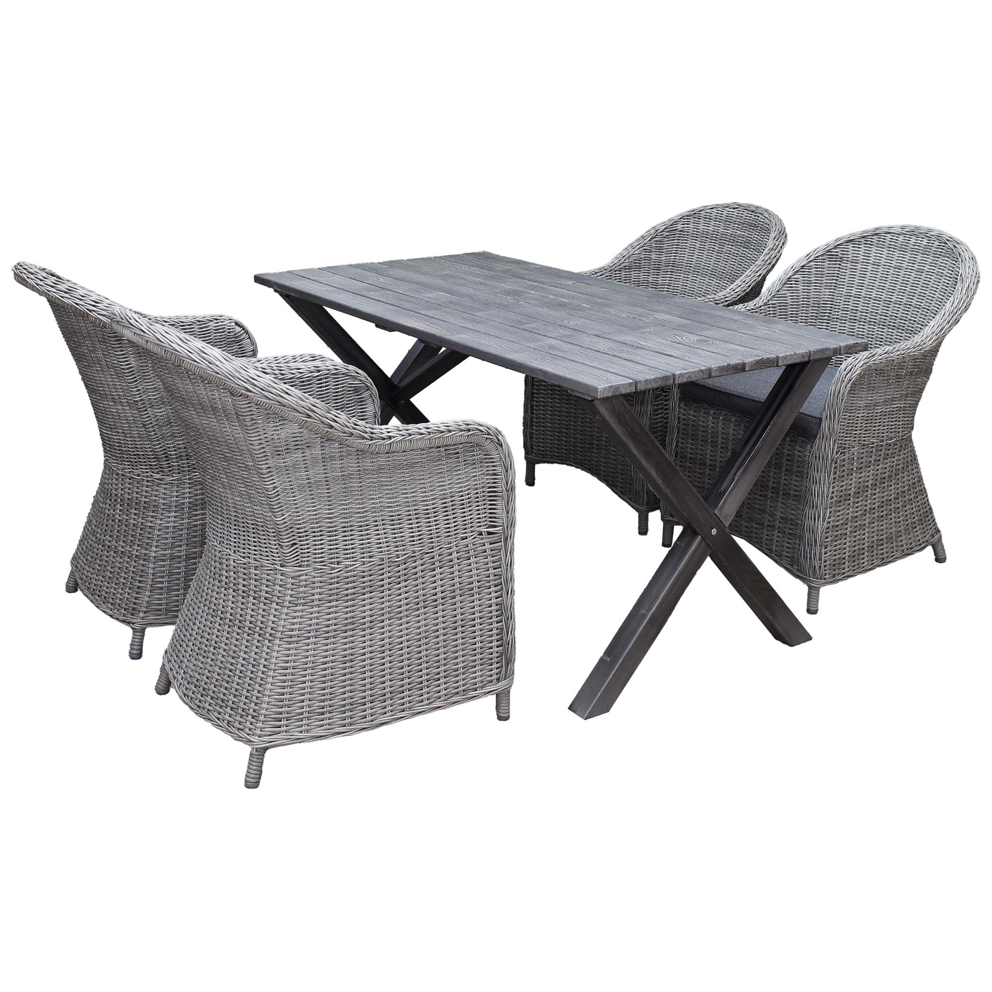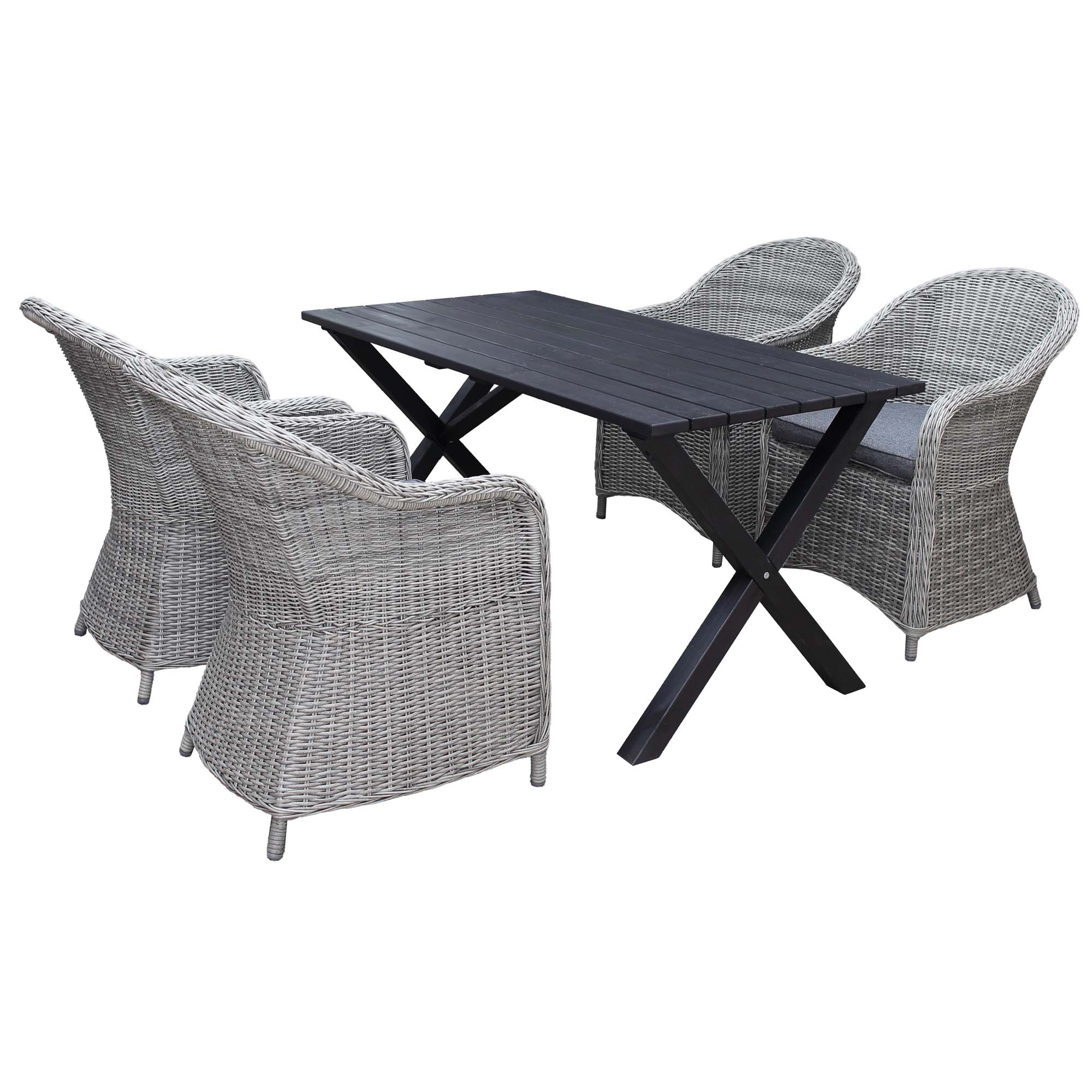 Trädgårdsmöbelgrupp med bord i massivt trä och 4 stolar i rotting. Möbelgruppen kombinerar naturliga material med tidlös design och erbjuder en bekväm sittplats för 4 personer.