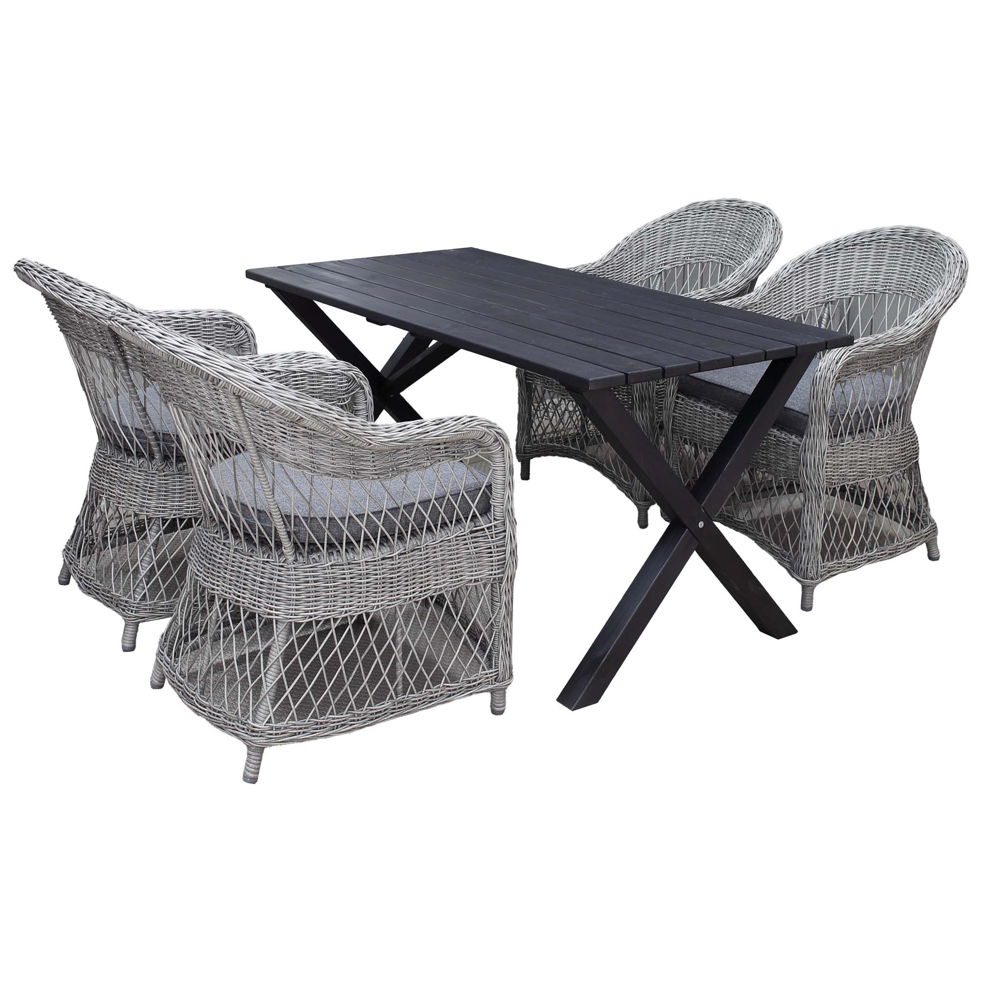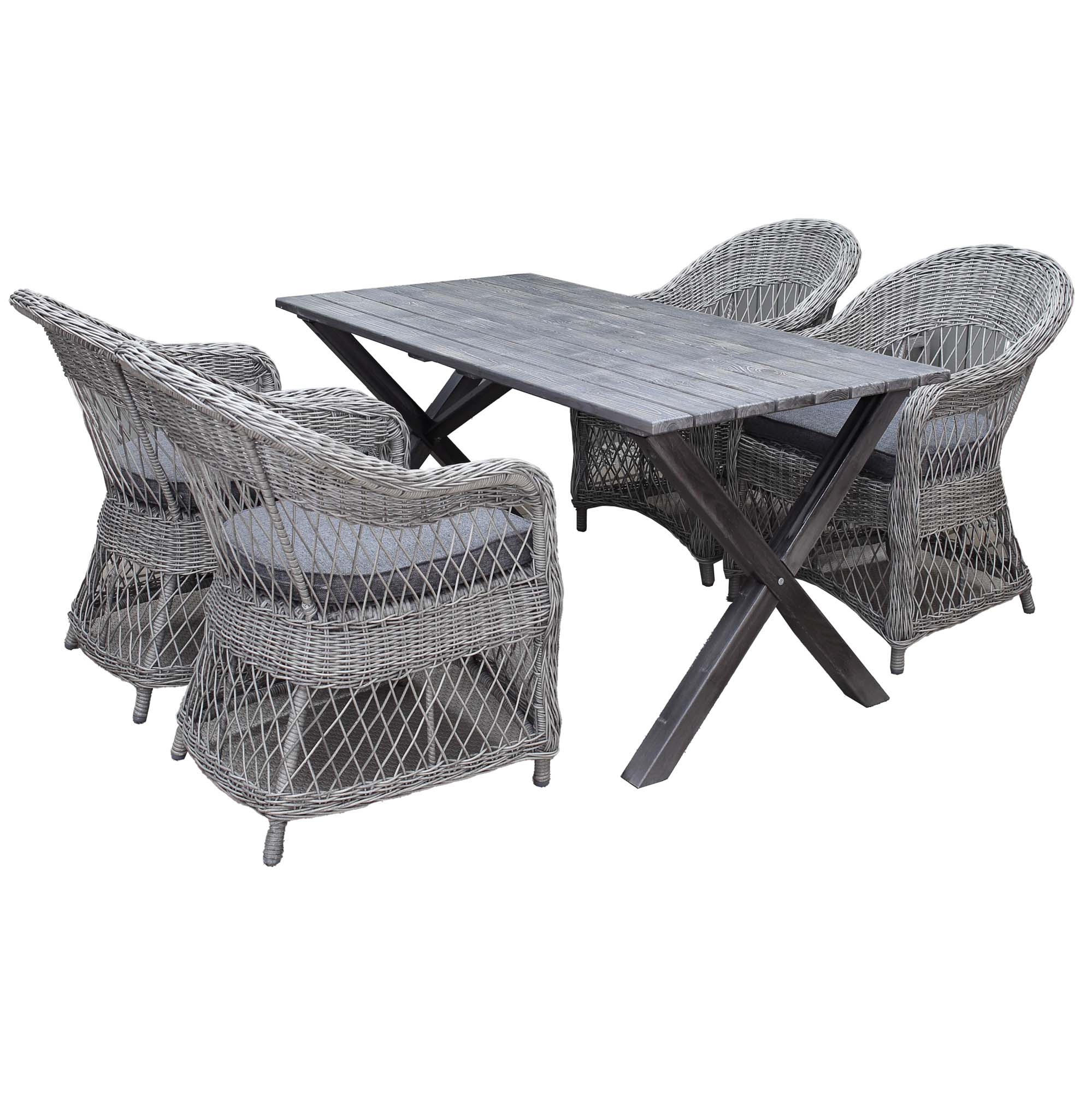 Modern trädgårdsmöbelgrupp med rektangulärt bord i massivt trä och 4 klassiska fåtöljer i konstrotting. Rymmer bekvämt 4 personer och passar perfekt för uteplats, altan eller trädgård.