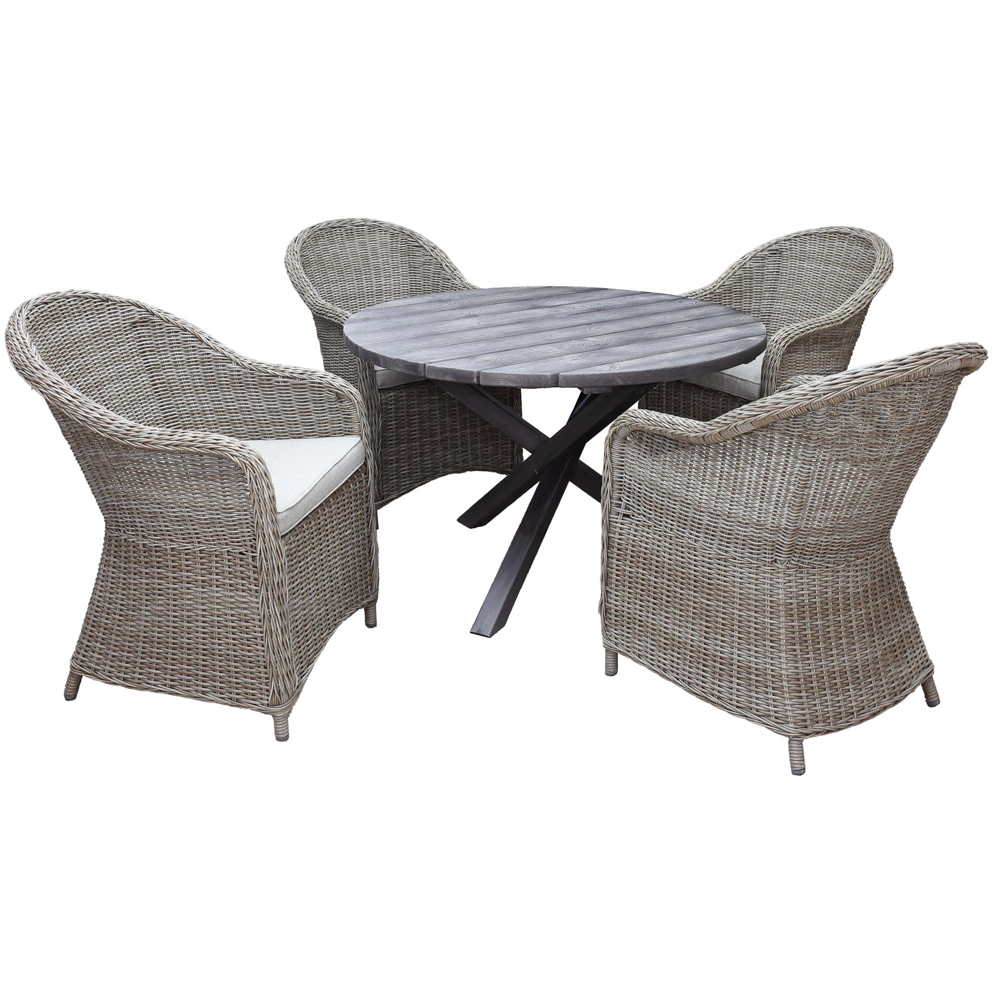 Modernt kombinerad trädgårdsmöbelgrupp med korsbent runt bord i massivt trä och ljusa armstolar i konstrotting. Tillräckligt med plats för 4 personer.