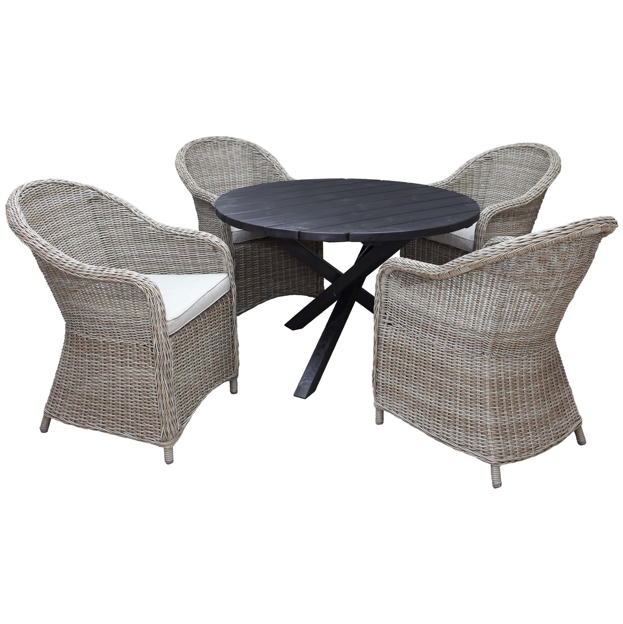 Modern trädgårdsmöbelgrupp med runt bord i massivt trä med kryssben och 4 klassiska fåtöljer i rottinglook. Rymmer bekvämt 4 personer och passar utmärkt för uteplats, altan eller trädgård.