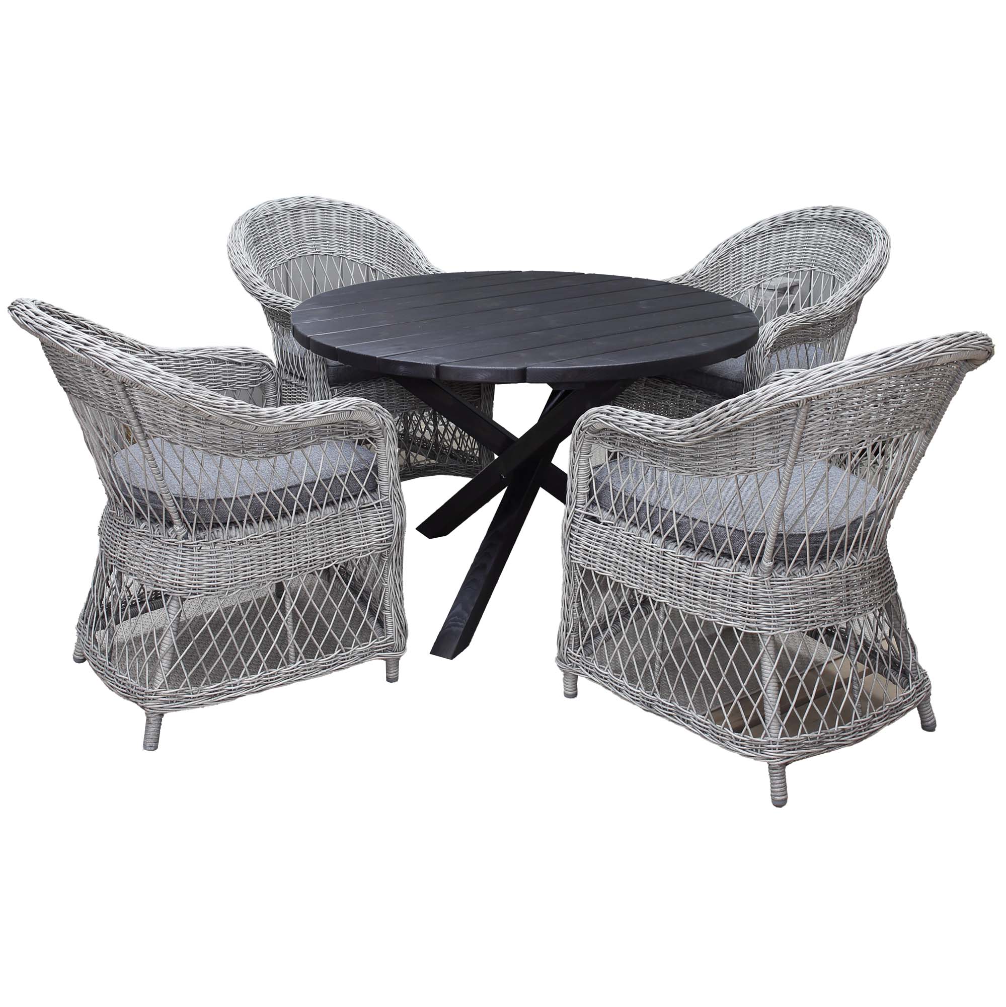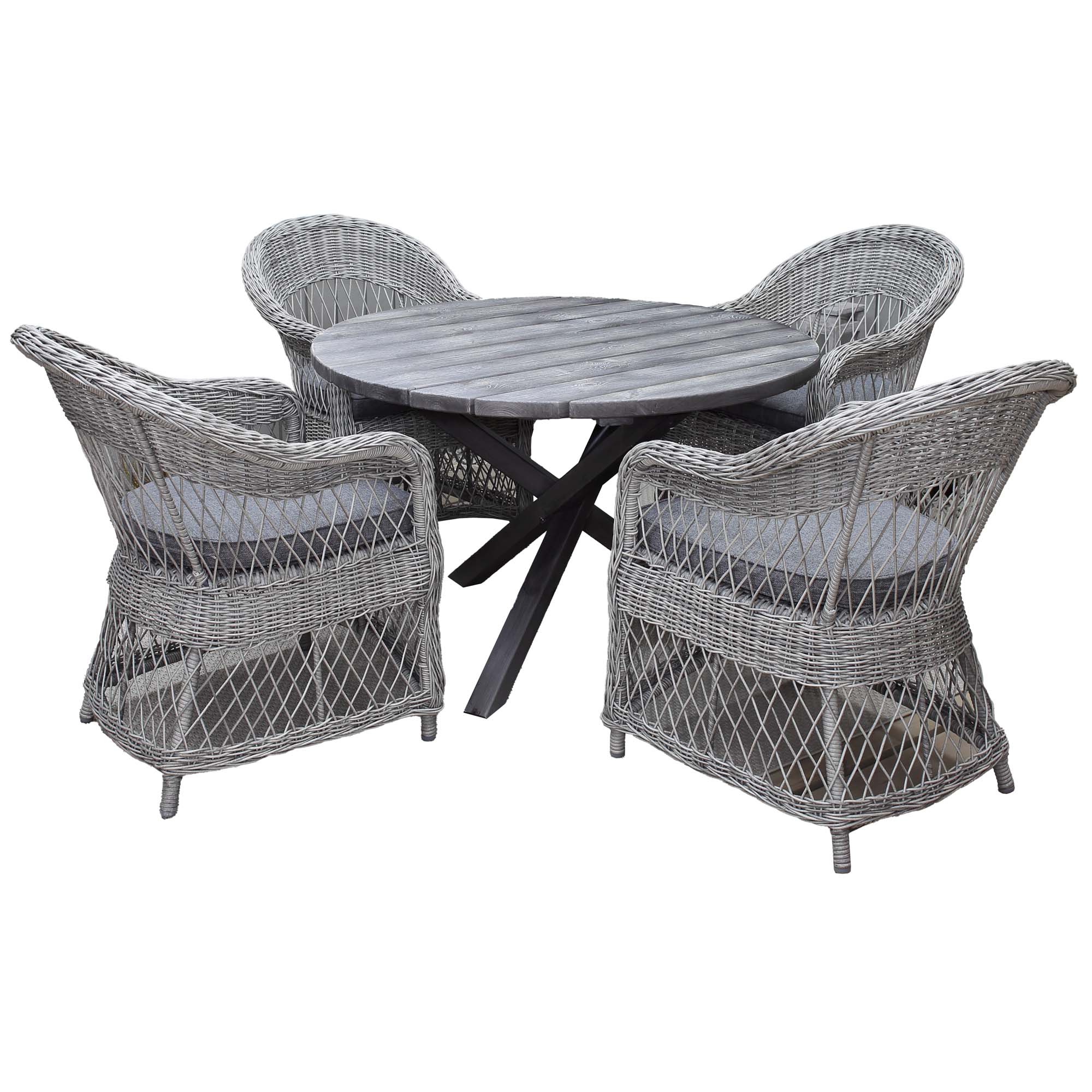 Modernt kombinerad trädgårdsmöbelgrupp med runt bord i massivt trä med kryssben och lätta fåtöljer i konstrotting. Gott om plats för 4 personer.