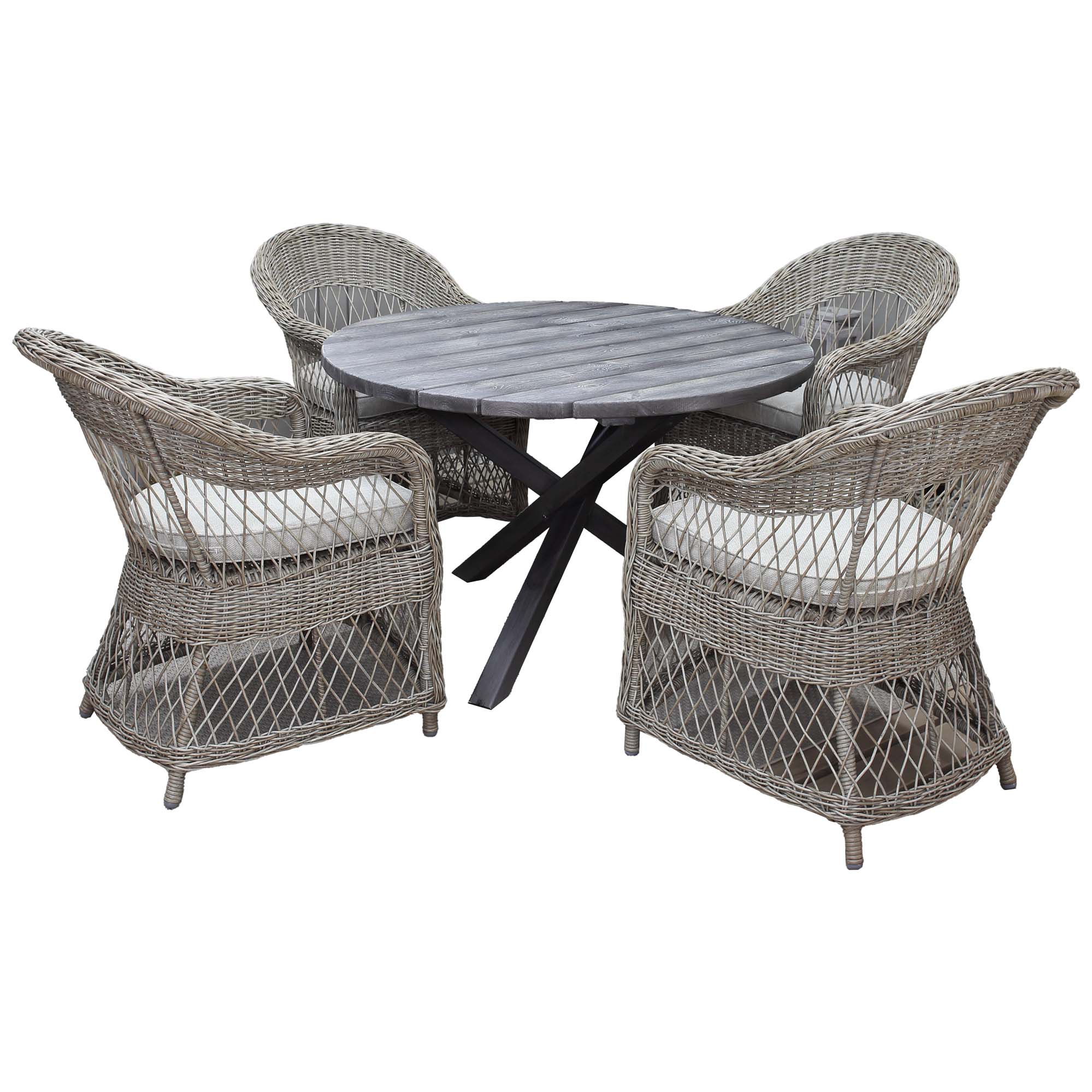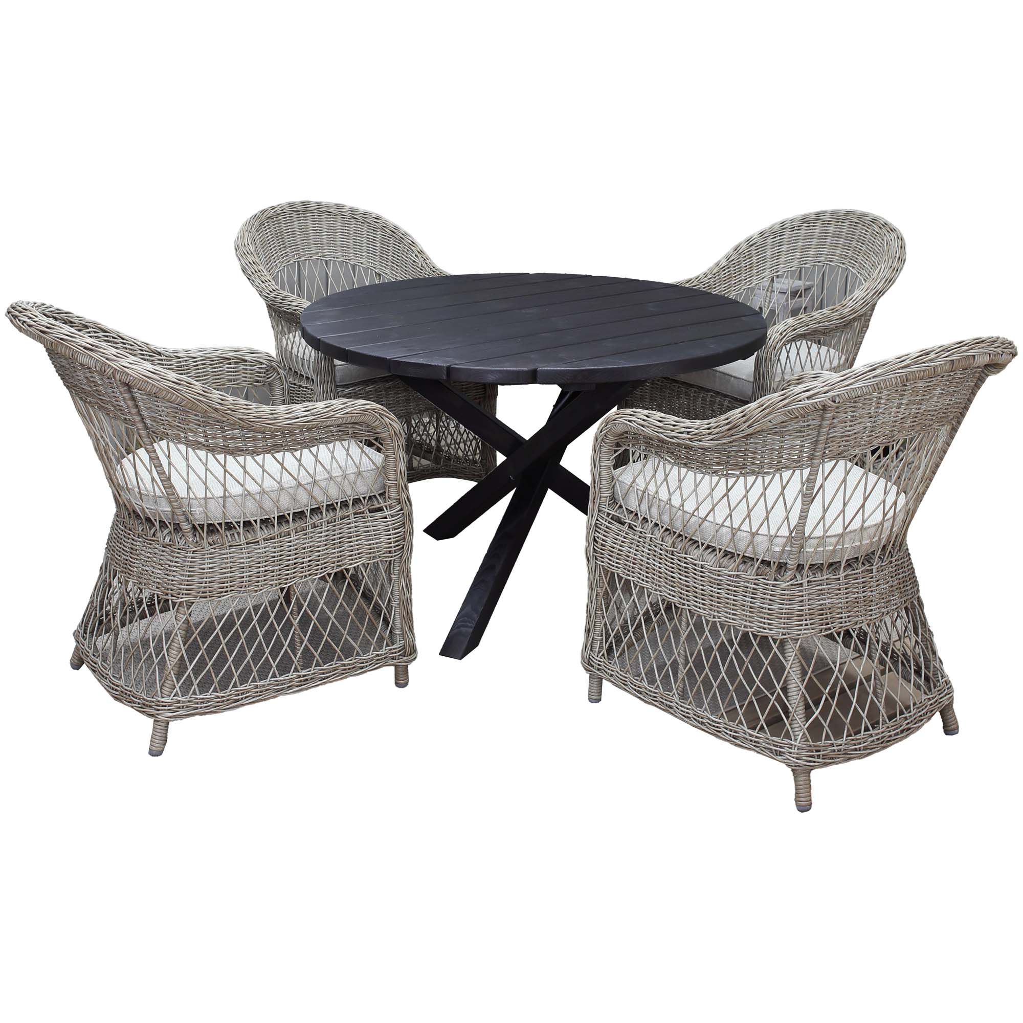 Modern trädgårdsmöbelgrupp med runt bord i massivt trä med kryssben och 4 ljusa fåtöljer i konstrotting. Tillräckligt med plats för 4 personer, stilren och bekväm för uteplats eller trädgård.